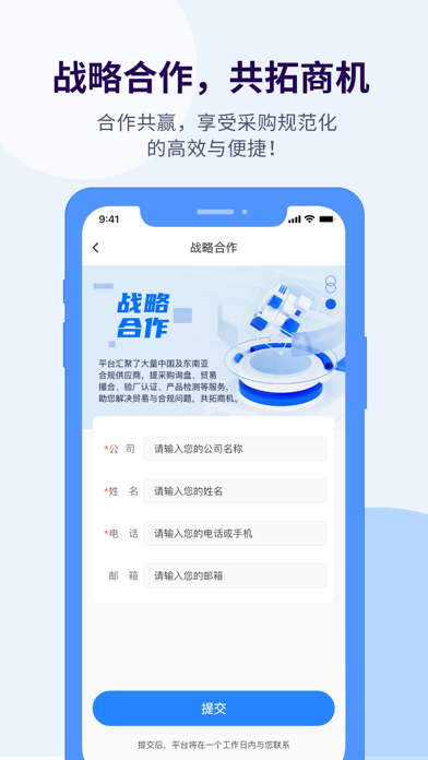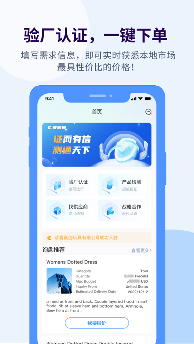 证测通是汇集认证、检测与培训的综合性一站式服务平台,致力于为全球客户在供应链合规上提供更透明高效便捷的服务! 平台将数字化、人工智能、云计算等智能技术应用于认证检测培训领域,为用户提供企业认证、产品检测、贸易撮合及培训等高质量服务。努力让企业和机构、咨询单位对接更加规范化,让用户能够在平台享受更透明、便捷、高效、安全的服务,满足企业多样化发展与降本提效的需要。 证测通平台本着“为每笔交易灌注信任,为合规贸易保驾护航”的美好愿景,为客户提供高效数据化平台,满足认证检测需求,打造更安全可靠的贸易集散地,让消费者享受品质生活,保障品质安全,推动合规创新。优化用户体验。