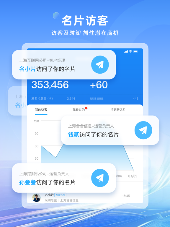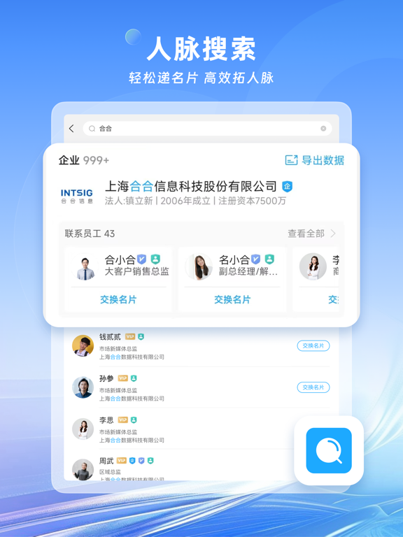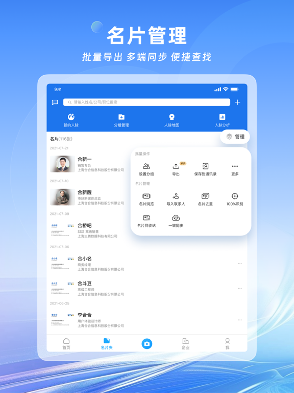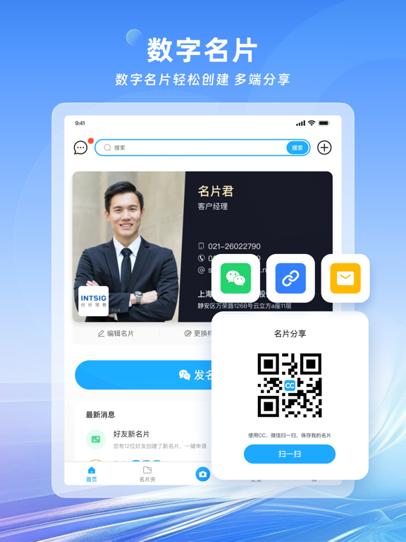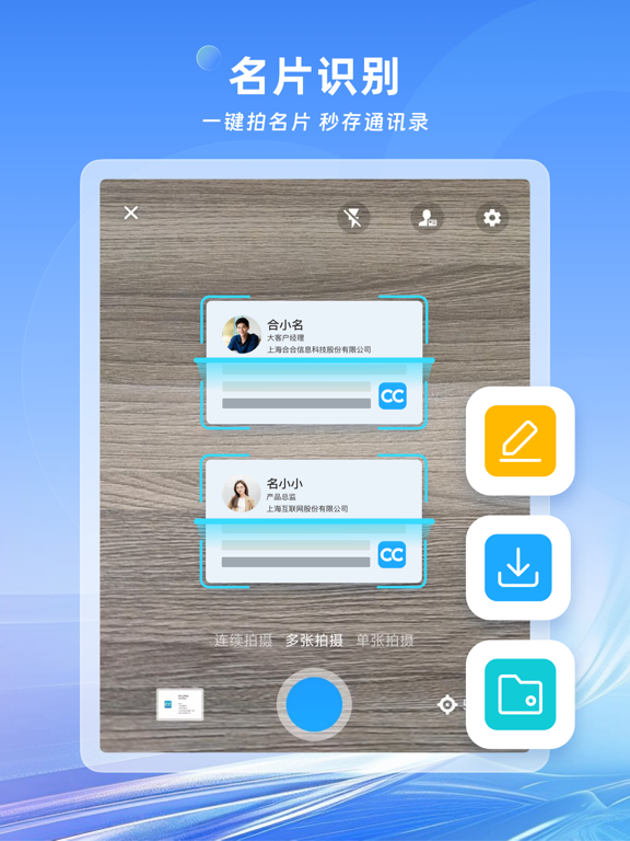 合合信息旗下的名片全能王深受海内外用户喜爱。 从纸质名片扫描管理、数字名片多渠道分享、拓展商务人脉,到查找、评估、联系企业,名片全能王帮你打通商业通道,助您建立更高效的商业连接。 产品支持拍照识别、批量导入、手动录入等多种方式采集和管理名片信息,并推出 数字名片 功能,支持一键分享至微信、企业微信、钉钉、QQ 等多平台,让个人和企业随时展示专业形象,获取更多潜在商机。 * “名片全能王无疑是所有名片识别软件的佼佼者”—纽约时报 * “绝佳地代表了智能手机时代人们如何管理联系人”—BBC * “瞬间保存销售线索,销售人员都推荐的软件”—Inc.com * “一堆名片一下子就全进了手机,用起来就是这么简单”—CBS ------为何要用名片全能王------ 一、扫描管理纸质名片 1、【手机拍名片,快速存进通讯录】 用名片全能王拍名片,自动扫描并精准识别名片上的信息,快速保存到手机通讯录。 支持单张拍摄、多张拍摄、连续拍摄、秘书模式帮老板扫名片、官方代扫名片等。 在互联网与智能办公趋势下,名片全能王不断升级迭代。 本次更新带来全新功能:新增AI 高精度识别 - 识别引擎全面优化,支持全球多语言名片识别,准确率更高。 - 支持多拍、批量等所有扫描场景的 AI 高精度识别,自动录入名片信息,告别繁琐的人工校对,效率倍增。 - 多国语言轻松识别与处理,帮你高效管理全球客户,拓展国际业务版图。 2、【云端备份,多终端同步,安全方便】 扫描保存的所有联系人,登录账号可实时同步到云端,安全备份不丢失。随时随地查找、编辑、去重、备注、分组管理。 3、【批量导出名片信息,便捷编辑及分享】 导出Excel或VCF文件,方便备份到dropbox等第三方网盘,以及导入到Salesforce、Google、Outlook等企业CRM中,是企业客户管理利器。 二、高效分发数字名片 1、【带经历成就的数字名片,提升竞争力】 名片全能王数字名片,既包含纸质名片的所有信息,还能添加工作和教育经历、个人成就、作品、项目等内容,让客户更了解你。 2、【名片更新即时提醒,不错失重要商机】 名片联系人的公司职位联系方式有更新时,即时给您发送提醒,让您可以及时送出祝贺,保持人脉新鲜。 3、【名片访客实时查看,不遗漏潜在商机】 有人查看您名片时,即使告知您,让您可以快速交换名片,拓展商业人脉。 4、【多种认证标识,更得到客户信赖】 实名认证、职业认证、企业认证,名片信息真实性更有保证,合作更靠谱。 三、多维度查询企业信息 1、【快速查询企业工商、信用、产品、服务等信息】 扫描保存完客户名片,点击名片中的公司名,就能查看名片主人的企业工商,注册资本、信用、专利等信息,帮您快速评估企业的靠谱程度。 如果你从事金融、投资、法律、商务,不用在电脑上刷半天网页费力查找,这些基本的企业资料,让你能快速评估一家企业大致的经营状态。 2、【轻松联系上企业,业务展开事半功倍】 还在网上找找找,花人情绞尽脑汁多方打听相关人脉联系企业?用名片全能王就可以轻松做到这些。 只需输入关键字:企业名、名片拼音,股东,高管,品牌,地址等等,就能快速检索到相关企业,进入目标企业详情页,可以看到该企业下主动公开信息的企业员工,找到业务负责人与他在线交换名片,让业务展开事半功倍。 从查找、评估、到联络,名片全能王帮你快速实现与企业对话。 ------升级VIP会员,享更多强大功能------ * 批量导出名片信息:导出Excel、VCF模式,便捷管理及分享 * 精准识别:AI+专业人工校对,名片信息正确识别,关键时刻快速搜到联系人 * 同步第三方CRM:Sales force、Google通讯录、Outlook * 多张数字名片:不同场合,不同职位,发不同样式的数字名片 * 秘书功能:设置秘书账号,整理名片TA来帮你做 * 代扫名片:成堆名片帮你扫,快速存入通讯录 * 地图模式:随时查看附近的联系人,拜访客户效率提升3倍 * 提升搜企业上限:每日搜索查看企业次数提升2倍 * 解锁更多企业信息:所属集团、历史工商信息、股东高管关联信息、疑似控制人、疑似关系、受益所有人等 * 企业数字批量导出:导出Excel,便捷管理分享跟进及查看 * 下载多种企业报告:PDF格式,便捷查看及分享 * 尊贵标识:开通会员,显示VIP会员尊贵标识 * 修改应用logo显示为会员专属 ------购买须知------ * 当您确认购买后,您的iTunes账户将被扣除相应费用; * 若当前订购周期结束前24小时内仍未取消续订,将会自动续订下个周期的VIP会员,并通过您的账户扣除相应费用; * 在当前订购周期内,无法取消当前周期的使用; * 您可通过iTunes账户的设置,随时管理或者取消您的订阅和自动续费。 * 隐私政策请访问:https://s.intsig.net/r/terms/PP_CamCard_zh-cn_IOS.html * 用户协议请访问:https://s.intsig.net/r/terms/TS_CamCard_zh-cn.html ------大家都在用名片全能王做什么------ 团队Leader:能识别16种语言的名片,对于客户散布全球各国的人来说,简直太方便了! 销售/采购:名片识别率高,瞬间保存销售线索,结识潜力客户,名片全能王帮我获得更多商机更多业绩。 市场/商务:微信群多,朋友客户傻傻分不清,一旦弄错很尴尬,现在跟客户聊就用名片全能王,公私分明。 金融/法务:做背调简直太给力!!不再花几个小时在十几个网站上找,企业详细背景资料唾手可得。 客户拓展:能轻松地创建和设计自己的个性化名片,并将其传播给更多的潜在客户和合作伙伴