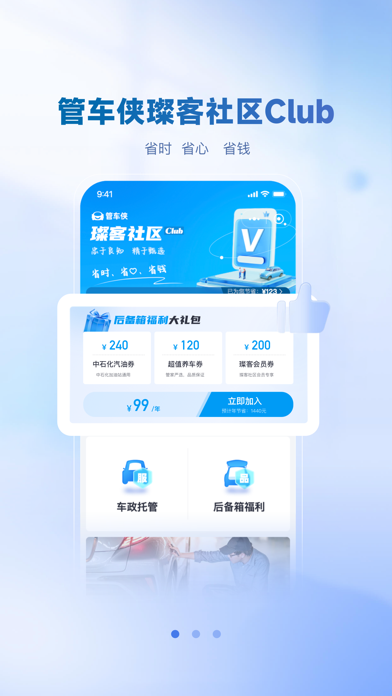 管车侠——您身边的私享车政管理专家 【特色功能】 —管车侠代办服务 20+项车务专业代办 专业 省时 省心 年薪18万管车侠随时为您服务 —专属管家服务 登录即享全方位的管家服务。实时用车提醒、1对1在线答疑、管家福利推荐,更有选品评测,从此用车找管家不找熟人。 —开启VIP,立享专属特权 成为管车侠VIP会员,尊享代办服务、底价保养、道路救援、快捷审车、景区免票游等特权,让用车更省钱省心省时间。 —周边车生活,您身边的福利站 基于您的位置,精选推荐周边商铺,提供价格优、商品全、品质有保障的生活用品。 【联系我们】 官方微信:管车侠(微信号:youtoo365) 官方网址:www.youtoo365.com 客服电话:4008-336-3651、改版了首页界面和功能,增加了新的业务模式 2、修复了一些已知问题