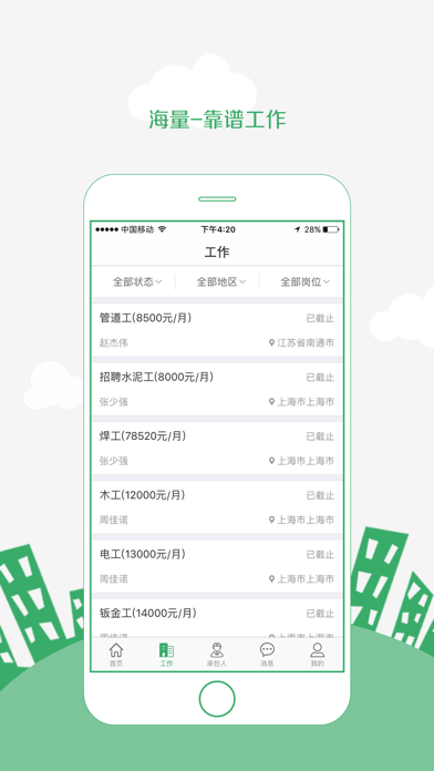 筑人网——致力于打造一个服务于建筑劳务市场及劳务项目管理的互联网平台。用互联网技术提高建筑行业劳务市场管理水平,竭诚服务于劳务市场四大主体(集团公司、劳务公司、劳务承包人、建筑工人),助力建筑行业劳务管理现代化。 【功能特点】 1.工程资源:海量工程用工讯息,助力劳务承包人寻找项目。 2.靠谱工作:各类工种用工需求,帮助建筑从业者找到对口工作。 3.便捷管理:项目签约、成员招聘、工资发放,纯线上操作,轻松便捷。 4.实用考勤:基于位置的手机打卡,方便实用。 【联系方式】 官方网站:www.zhuren360.com 官方微信:筑人网 微信号:zhurenwang1 客服电话:400-633-12381.修复已知问题