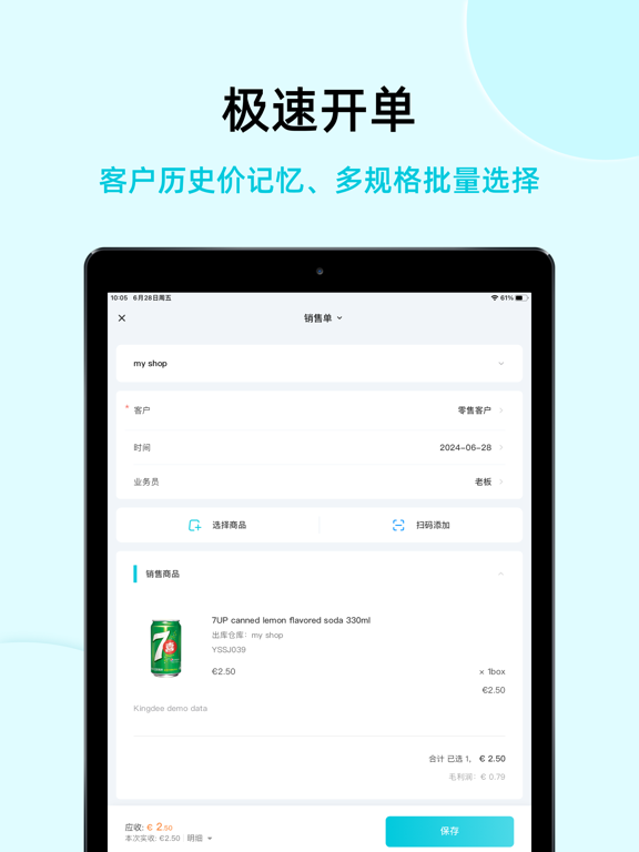 【简单易用的国际版进销存,全球300万批零商户的共同选择】 智慧记国际版(Ailit),是金蝶智慧记为全球批发零售商户打造的专业进销存软件。支持多语言、多币种、多汇率等境外经营场景,帮助店铺进行开单打单、商品管理、出入库管理、仓库管理、店铺管理、员工绩效管理、销售管理等生意经营活动。简单好用,5分钟上手,一对一专业客服指导,现已覆盖154个国家与地区,成为30+细分行业、全球300万批零商户的共同选择。 【核心功能】 ①多语言系统:内置5种语言(中文、繁体中文、英文、葡萄牙语、西班牙语),老板看中文,员工看外语,系统语言可根据员工习惯自由设置,多员工同时开单,数据互通,智能记账 ②多语言单据:一键切换单据语言,支持自定义设置单据模板,添加图片、LOGO等信息 ③多币种结算:账单支持154个国家货币符号切换,金额小数点位、标点符号自动匹配货币符号,多国汇率自动更新,对账智能换算,支持不同国家客户用不同货币智能记账 ④多商品税率设置:针对不同商品设置不同税率,开单自动换算 ⑤多端协同:支持Windows、MAC、iPhone、iPad等多个平台,支持多员工同时使用,数据实时同步 ⑥销售开单:扫码自动填入商品名称、图片、价格等信息,智能计算利润;支持单品、整单百分比折扣、直接优惠扣减;支持收订金的销售模式,支持三联、A4、小票等主流单据格式 ⑦库存管理:扫码一键查询库存,出入库明细记录;支持预先设定进货订单,防止出现到货偏差、价格偏差等情况;支持以销定购,可先销售再采购,避免压货;支持保质期,批次管理;提供库存预警,低库存、高库存、安全库存、补货量参考;支持多仓库,分仓库存明细,库存货款总金额查询;支持商品多规格、多单位、多价格管理,多店数据互通,统一管理,并支持连锁经营,有效满足多门店多仓库的经营管理需求。 ⑧客户管理:支持客户分类、积分、欠款、电话地址等基本信息管理,可对不同客户设置不同的商品价格。支持客户、供应商双身份特殊场景,当对象即是客户,又是供应商,欠款可自动扣减。 ⑨经营报表分析:支持销售分析,销售报表、商品利润、经营利润、热销分析、员工业绩统计、库存分析,进货统计、库存统计、收支对账,客户对账、供应商对账、资金流水 【数据安全】 1.ISO27001国际信息安全标准认证 2.国内电信级IDC机房数据存储 3.全球CSA云安全联盟成员 【适用对象】 适用于在境外开展批发业务、零售业务的小微个体工商户,覆盖食品酒饮、五金建材、家具装饰、数码家电等30+行业 【品牌保障】 金蝶上市公司30年技术沉淀,14年进销存行业领域深耕,国家高新技术企业,深圳工业与信息化局推荐名单,信息安全等级保护二级 【建议反馈】 感谢您的使用,若您喜欢智慧记国际版(Ailit),请花一点时间给我们评论。 在使用中有任何问题和意见均可通过以下方式反馈: 官方网站:www.zhihuiji.cn 微信公众号:izhihuiji或金蝶智慧记 企业QQ:800-821-860 客服热线:400-830-8060 联系地址:广东省深圳市南山区科技南十二路金蝶软件园1、新增阿拉伯语,泰语 2、修复已知问题