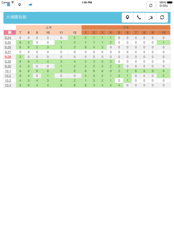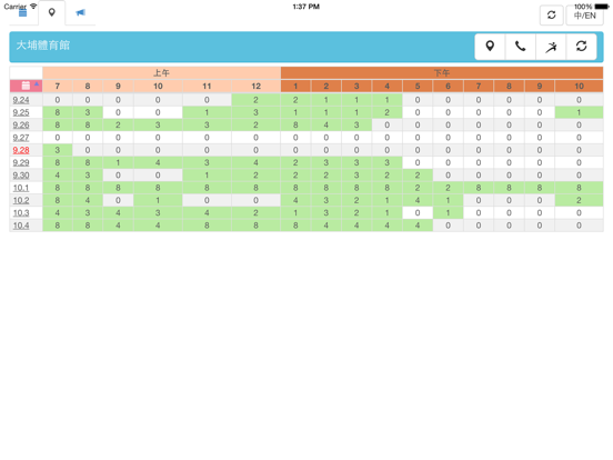 一眼睇晒全香港96個康文署羽毛球場地,唔駛上康體通逐下click! ==================================================== @注意 1) 本程式只能作查詢用途,要book場還是乖乖地去康體通吧.....Orz 2) 人手有限,盡量保持每半小時更新一次。當然,瞓覺時間除外! ==================================================== @快速搜尋 輸入地區、場地名或地址,就即刻揾到資料 @日期模式 先揀日子,再揀地區和場地,咁就睇到全日咁多個時段。綠色格仔代表有場,格仔裡面o既數字係剩番幾多個場,就係咁簡單! @場地模式 在「日期模式」按場地名,就會跳到呢版,一眼睇晒該場地o黎緊11日幾時有場book,約人打波都易D! 工具列: x 用Google Map看看場地在哪裡 x 打電話比場地 x 去康體通Book場 x 更新 @ 公告欄 最後更新時間和消息公佈 @免費?真係咁So? 係!我地一班熱血波友無時無刻check住邊度有場,義務update呢個app。 想keep住一眼睇晒全港九新界邊度有場?咁就幫手share下啦!- 支援 iOS 17