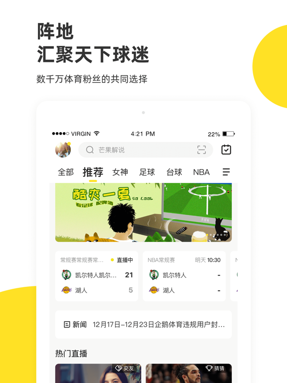 企鹅体育(原企鹅直播),互动式体育赛事直播平台。 1、【“体育明星”陪你看直播】知名主播陪你一起看球赛,实时互动零距离! 2、【无畏距离,随时战】 鹅赛场上线,让用户可以在线上面对面的比拼体育项目,通过物联网及技术算法的升级,只要开启鹅赛场模式,便可以随时找寻全国对手来一次”面对面”的跨地域竞技,看谁才是真正的运动达人,不服来战! 3、【海量高清赛事,24小时直播】 热门赛事,NBA篮球、各国足球赛事、NFL、拳击、排球、网球、斯诺克、健身等50多种运动项目16000多场热门赛事直播和视频! 4、【看比赛玩游戏,好看又好玩】 过去,看球赛是一个人的事; 现在,有风趣专业的主播、幽默的妹子等特色主播给你解说赛事,是目前超好玩的体育直播。 5、【NBA头条,7X24小时资讯】 及时,专业,有深度的赛事报道, 全球体育资讯、高品质原创内容、原汁原味球星生活动态 。 想看NBA直播、台球直播、足球直播尽在企鹅 官网:http://live.qq.com/修复线上已知问题~