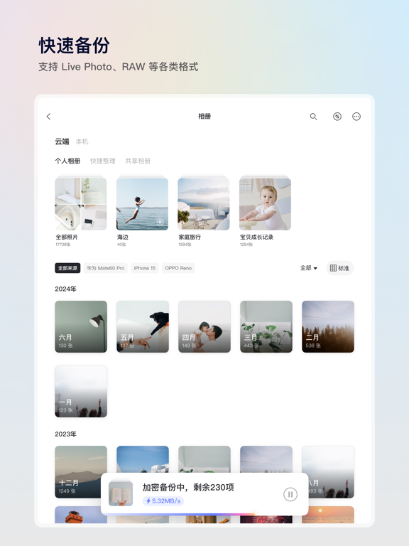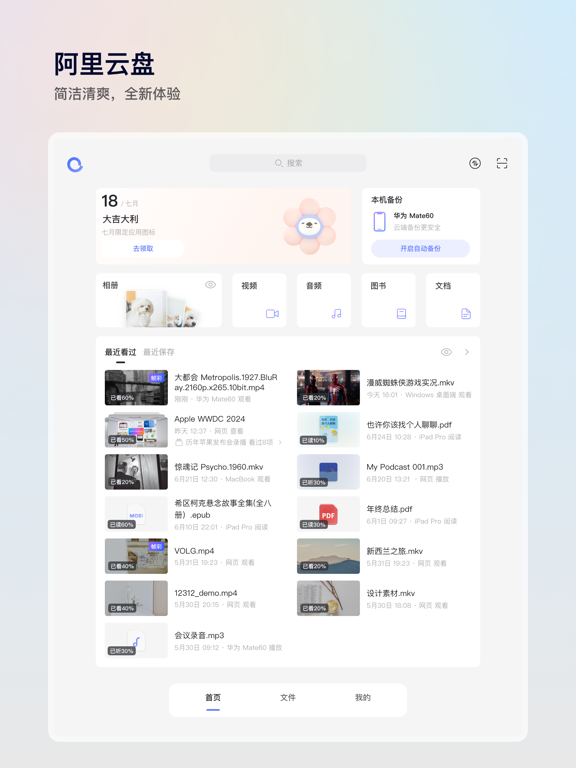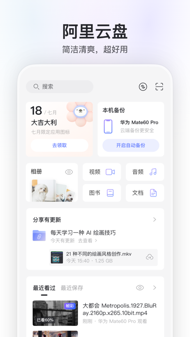 阿里云盘是一款速度快、不打扰、够安全、易于分享的网盘,由阿里巴巴集团出品。 畅快地存储到云端 ● 快到飞起,尽享极速上传下载 ● 支持大文件上传和批量上传 ● 一键开启自动备份手机相册 随时与家人朋友分享 ● 灵活设置有效期和密码 ● 查看被浏览和下载次数 ● 一键转存感兴趣的内容 在线浏览、播放和编辑 ● 原画质播放和逐帧预览 ● 轻松在线解压缩文件 ● 在线编辑 Office 文档 安全可靠的存储空间 ● 没有任何广告干扰 ● 保障个人隐私和资产安全 ● 阿里云数据、传输技术沉淀 了解更多产品进展,欢迎关注以下渠道 官微:阿里云盘 「连续包月包年超级会员说明」 1. 服务名称:阿里云盘8T超级会员连续包月连续包年 2. 价格:阿里云盘8T超级会员连续包月18元/月,连续包年168元/月 3. 购买连续包月连续包年的阿里云盘账号,会在每个月到期前24小时,自动在iTunes账户扣费并延长1个月的会员有效期。 4. 如需取消订阅,请手动打开苹果手机“设置”--> 进入“iTunes Store 与 App Store” --> 点击 “App ID”,选择“查看 App ID”,进入“账户设置”页面,点击“订阅”,选择阿里云盘会员连续包月,取消订阅即可。如未在订阅期结束的至少24小时前关闭订阅,此订阅将会自动续订。 5.连续包月连续包年用户在续费日前5天会收到站内信提醒,可在「我的」页面右上角通知中心查看 6. 阿里云盘会员自动续费协议:https://terms.alicdn.com/legal-agreement/terms/product/20220722172209928/20220722172209928.html 7. 阿里云盘隐私协议:https://www.aliyundrive.com/protocol/privacy?showTitle=false-优化了产品的使用体验