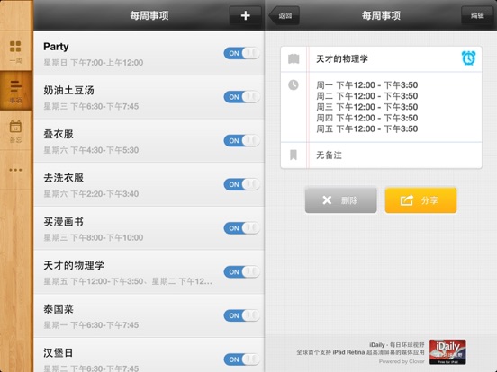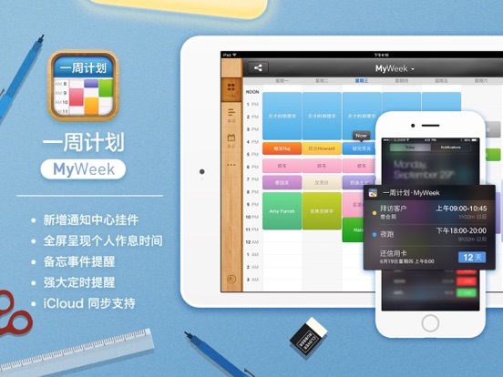 「MyWeek·一周计划」是一个帮助你计划每周时间安排的超精致应用,每周五晚上看 Big Bang? 周二看电影? 周日打星际II? 周末 Diablo III 之夜? 一切就和你最熟悉的时间表一样简单,方便。支持提醒,还有超级便捷的事项倒数日备忘功能。 =特别亮点 · Special Feature= 1.「每周计划一览」简单直观,Now 标记时间坐标,摇一摇有惊喜 2.「事件备忘提醒」和客户开会?买生日礼物?还信用卡?倒数日备忘一目了然 3.「强大定时提醒」每日提醒,每事件提醒 4.「支持多计划表」休假安排?冲刺安排?女友时间安排? 5.「通知中心挂件」方便地查阅近期事项与备忘 6.「人性的定制化」自定义作息时间,栏目次序随意调整 7.「分享是美德」将你的日程安排通过新浪微博或 Email 分享 我们倡导一种有规律的生活方式,玩的尽兴,工作高效。 「MyWeek · 一周计划」由「iDaily Media · 每日科技」荣誉出品:全球最具影响力的中文媒体应用创造商,为超过 1.8 亿中文 iOS 用户服务。 ----------------- 关于程序内提供的「按月订阅」功能: 您可以在程序内使用 iTunes 自动续订功能获取会员专属功能,我们提供「每月 CNY ¥3」套餐。 确认购买后,将会从您的 iTunes 帐户中收取费用。您可以在每个周期结束至少 24 小时前取消下个周期的订阅,每个周期结束 24 小时内将会自动续订,已订阅的周期将无法取消。 隐私保护政策:https://clover.ly/privacy 用户使用协议:https://m.icity.ly/tos· 新增风格:「立体主义」计划表风格 · 新功能:日历可为每天设置不同高亮颜色 · 新功能:事件可通过「结束时间」设置时长 · 新交互:在事件备忘列表可下拉添加新事件