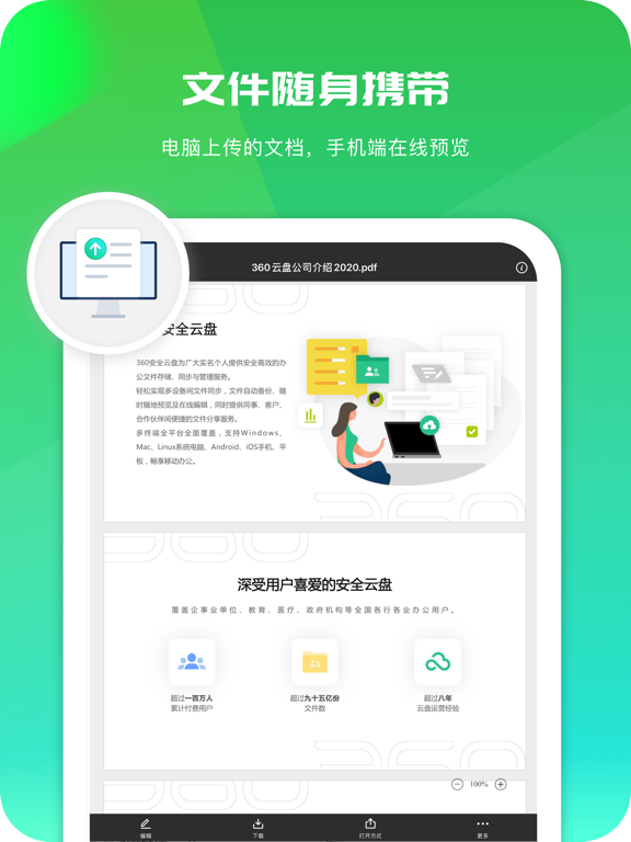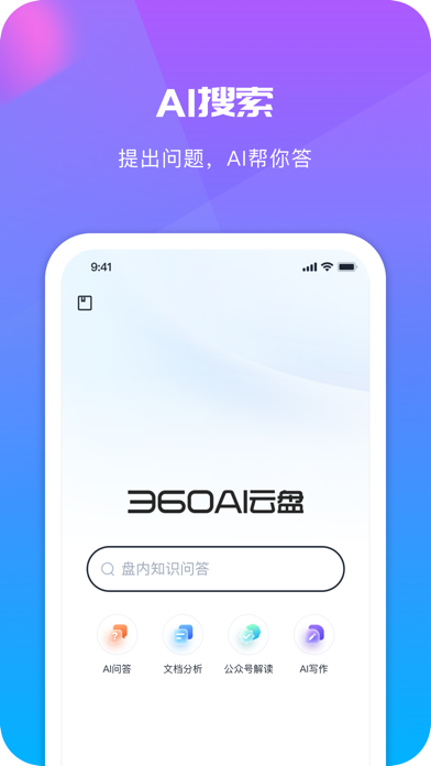 360安全云盘拥抱AI,全面升级为360AI云盘,DeepSeek高速专线接入。 【360AI云盘】提供安全高效的文件存储、同步与分享服务。轻松实现多设备间文件同步,相册自动备份、随时随地预览及在线编辑,同时提供同智能的文档处理、知识问答,及各种AI应用服务,让存储更高效,知识应用更智能。 【超强AI】DeepSeek高速专线、360智脑AI大模型强力接入 【超大空间】超级会员专享6TB大空间,文件任意存储 【AI搜索】盘内知识问答,查询文档内容更快更精准 【AI应用】文档分析、公众号解读、文档扫描,更多文档小应用助你高效办公、学习 【多端同步】文件安全存储,实时同步,支持手机、电脑、平板等多端使用 【相册备份】手机照片自动备份,节省手机空间,省心省力 【在线预览】多格式直接在线预览,无需安装专业软件,随时随地查看 【便捷分享】随时随地,文件一键分享给同事、好友 连续包年会员说明: 1. 服务说明: 360AI云盘高级会员100G、200G空间连续包年。 2. 价格:360AI云盘高级会员100G连续包年118元/年,高级会员200G连续包年238元/年。 3. 购买连续包年的云盘账号,会在会员到期前24小时,自动在iTunes账户扣费并延长 1年会员有效期。 4. 取消自动续费:若需取消自动续费,请在会员到期前24小时之前,进行取消操作。取消方法:您使用苹果ID开通的自动续费产品,在“设置”-“iTunesStore与App Store”-“Apple ID”-“查看 Apple ID”-在账户设置页面点击“订阅”-取消360AI云盘自动续费高级会员订阅即可。 5. 360AI云盘会员自动续费服务协议: https://www.yunpan.com/index/renewagreement?d_type=undefined#/ 6. 360AI云盘隐私政策: https://www.yunpan.com/index/privateagreement?d_type=undefined#/ 7. 360AI云盘软件使用协议: https://www.yunpan.com/index/agreement?d_type=undefined#/修复已知问题,提升产品性能
