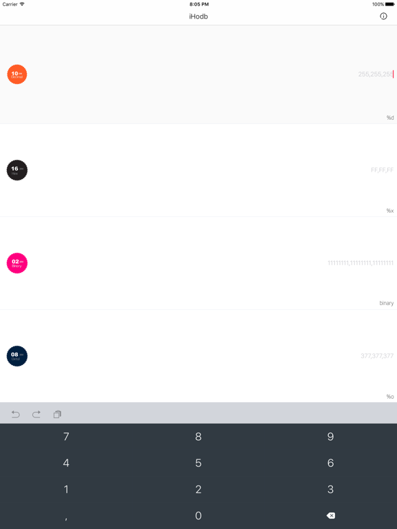 极简换算 - 十进制/十六进制/二进制/八进制换算工具, 极简的往往是最好的。 iHodb, an small app that I am looking for conversion of Decimal/Hex/Binary/Oxtal. - Simplest Always Best. Hope to help programmers, designers, or college students. 示例: 当你在十进制行输入“255,255,255”的RGB颜色时,十六进制的色值“FF,FF,FF”会立即在十六进制行里显示出来。因此,这对于程序员或者UI设计来说将是非常有用的。当然,你还可以复制或粘贴这些数值。 Example: If you input an RGB color like "255,255,255" at Decimal Row, the hex string "FF,FF,FF" will display at the Hex Row immediately. As a result, it is very useful for programmers or designers. 其实 很低调,只是 这个 想法 太招摇 每一次改变都是为了与众不同。 Any change seems to be different and exciting. 关于我们,Zero Status|零,一种若即若离的状态,一种低耦合的生活态度。 有人说90后才是正常的一代,如果我们之间有1000步的距离,你只要跨出第1步,我就会朝你的方向走其余的999步。Zero Status崇尚的是一种低耦合的生活态度。倘若你跟我们一样,请让我们知道你的存在。 欢迎来信畅言您的诉求,我们的进步离不开您的支持。(support@lessney.com) 1. iOS 26 适配。