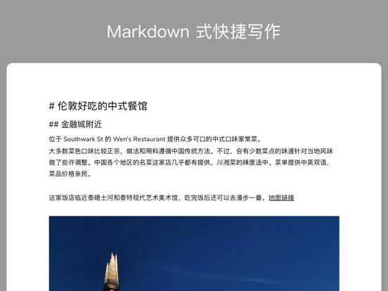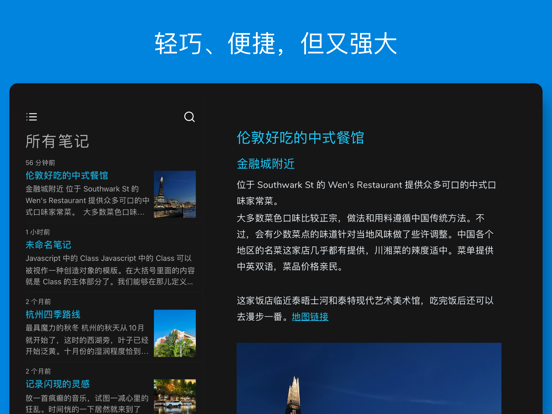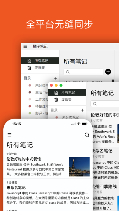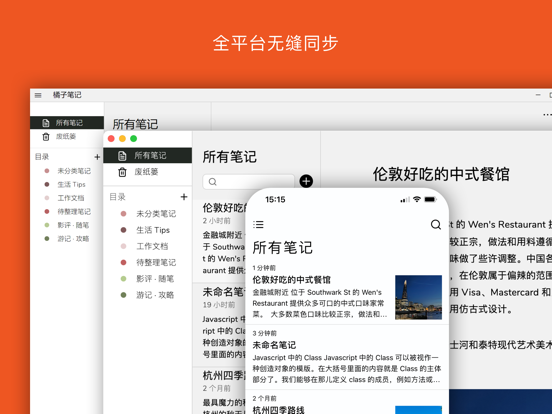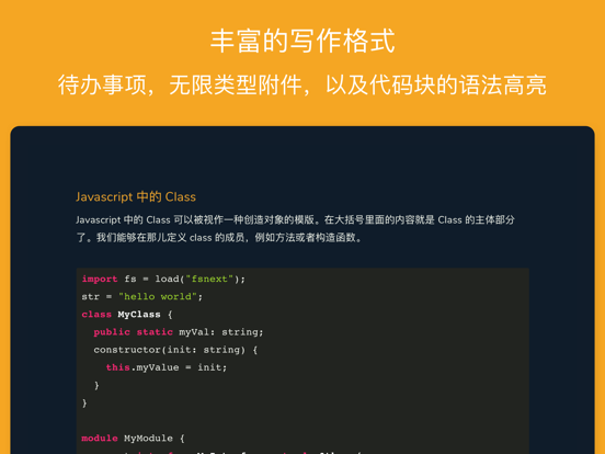 终于遇见你! 橘子笔记是一款漂亮、简洁又强大的多平台写笔记软件,它具备许多有趣的功能,会让您爱上写作。 橘子笔记支持多个平台的使用,无论是记录闪现的灵感,亦或是写写日记、整理思绪、储存文档,任您所想,非常方便。所有的这些也能无缝同步到您的其它设备上。此外,它还拥有多套精心设计的颜色主题,让您随时切换写作心情。 ■ 轻巧,好用,身轻如燕 橘子笔记身形小巧但内在强大。不同于市面上其它笔记软件,橘子笔记遵循实用性原则,所有功能经过我们的精挑细选和认真考虑。 ■ 丰富的写作格式 无论是像作家一样创作,还是日常生活学习的笔记记录,橘子笔记提供丰富的写作格式让您游刃有余。 除了基本的写作格式外,app支持照片或文件插入,作为笔记附件永久存档并同步; 笔记内置待办格式,您能够使用它来跟踪哪些项目已经完成,哪些还是待办; 如果您是程序员,您能够在这里珍藏各种代码,笔记编辑器内置的“代码块”格式会进行语法高亮。 ■ Markdown 式快捷输入模式 想输入标题?按下 # + 空格,就这么简单。 橘子笔记支持实时 Markdown 式快捷转换,采用标准 Markdown 快捷键,让您可以不用考虑工具栏在哪,就能轻松切换格式。 ■ 特别设计的专注模式 只需轻点,就能让您当前编辑的段落“亮灯”,而其它内容自动降低亮度。 当您开始新的段落,高亮也会自动转移。 有了这个模式的帮忙,您能够轻松集中注意力于当前的想法和段落而不会分心。 ■ 跨平台同步 橘子笔记支持 Google Drive 或 iCloud 来进行同步。 您的笔记将会实时自动同步和更新到所有设备上。橘子笔记拥有一套智能同步系统,能够聪明的感知和计算同步时机;这儿没有手动同步按钮,您只需专注于写作,其它事情,让橘子笔记帮您做。 不论您选用的是哪种云服务,都将在 Mac/iOS, 或Windows PC 和其它平台的手机上可用。得益于 Apple Cloudkit ,您现在可以使用其它平台的手机继续同步您在 iCloud 上的内容。 ■ 多套漂亮的颜色主题,支持系统深色模式 我们为整个 App 提供多套漂亮的主题。快速更改而无需重启 app,一扫倦怠,即刻调整您的写作心情。