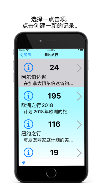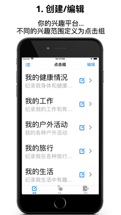 「点击美好记录」是一个别具一格的文字记录app,通过简单点击屏幕,你可以创建一个新的、带有时间和地点位置信息之记录。这些带有时间、地点和内容(When, Where和What)的记录,将会帮助你更好地回忆起过去:你的想法、事件、活动,以及一些重要的数据。 本app的数据结构是基于如下一开放式的框架: * 用户将自己各种不同的兴趣范围定义为点击组; * 在一点击组内,将具体的兴趣项定义为点击项。 建立好自己的兴趣框架之后,在发生的时间和地点,点击创建新的点击记录: * 选择一点击组; * 选择一点击项; * 点击创建一新的点击记录;时间和地点信息同时会自动记录下来; * 键入一段文字作为点击的文字描述。 搜索和查看过去的点击记录: * 强大的搜索功能; * 查看用户当前时间和地点相对于某一点击的时间和地点的信息; * 查看一点击相对于前后点击的时间和地点信息; * 地图显示点击; * 将记录的数据可输出到各种不同格式的文件,通过分享输出; * 未来的更新将会增加有更多、更丰富的功能。本app这次做了如下重大更新: * app的名字由原来的「点击计数-3W」改为「点击美好记录」。 * 许多用户界面都进行了改进,更易于用户的理解和使用。 * 第一次使用的用户,app提供了一个兴趣平台样本,这将可以让用户便于熟悉app的用户界面和各种功能。一旦用户完全理解和熟悉了app的结构和功能,我们建议用户根据自己的情况重新定义自己的兴趣平台结构。 * 更新解决了app中的一些问题和个别的突然崩溃。 欢迎您使用「点击美好记录」,点击创建自己的美好记录信息。请在app菜单的本app博客链接处,给我们提出使用app过程中所发现的问题、疑问、以及改进的建议。我们将在今后的不断更新中适当采纳您的反馈。
