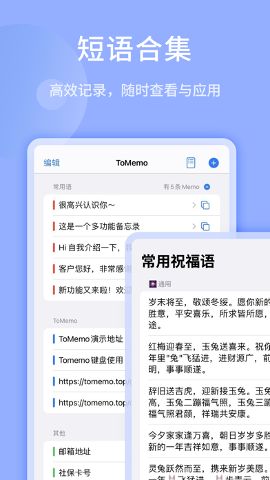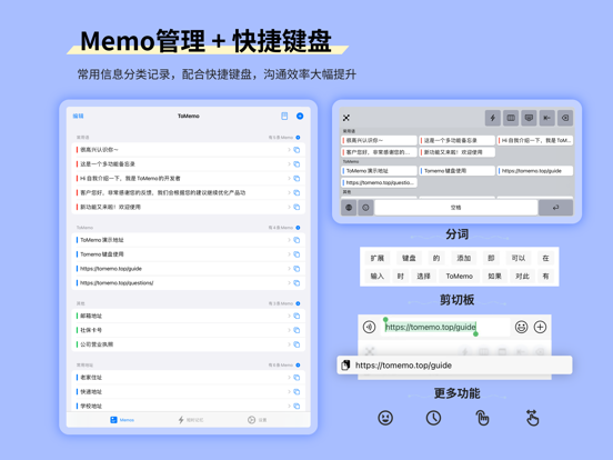- 太多地址、密码、电话号码...记不住? - 微信常用语、群聊祝福、自我介绍等...不想重复打字? - 想要连续复制文本,批量加入剪贴板历史? - 玩游戏、追电视、看直播…需要刷屏扣号引起关注? 使用ToMemo,多种功能帮你满足日常需求! ToMemo,一款超好用的集合多功能快捷键盘的内容收纳工具,可以帮你快速输入常用信息,随手剪贴需要的临时片段,让你在多种场合实现一键发送,大幅提升沟通效率。 ====== 特色功能 ====== ·【懒人短语】常用信息分类记录,一次记录省心未来 ·【快捷键盘】快速发送已有内容,沟通效率大幅提升 ·【个性设置】支持自定义键盘高度、多种键盘布局、自定义时长留存、输入后自动切回原输入法等多项偏好设置,输入习惯跟你走 ·【智能分词】长文字信息按需拆分使用,不同场景使用更方便 ·【剪贴历史】支持同步多条剪贴内容,多种交互方式输入一气呵成 ·【快速跳转】Email和网址,通通可以快速跳转打开默认应用 ·【滑行光标】滑动键盘底部,光标轻松跟随 ·【日期&时间】一键添加当前日期和时间,输入更省力 ·【emoji表情】呆萌emoji表情都到我的碗里来 ·【iCloud同步】支持数据同步与恢复 ·【中英齐全】支持两种语言,跟着系统来 ·【Spotlight】常用的内容在首屏也能一触即达 ====== 如何使用ToMemo ====== 【第一步】添加内容: 打开ToMemo -> 新建分类 -> 添加常用内容 【第二步】设置扩展键盘: 进入应用设置页 -> 找到「添加扩展键盘」-> 点击进入系统设置的键盘页,开启ToMemo键盘 【第三步】使用: 在任何需要输入内容的地方,长按或点击软键盘球形的按钮可以切换键盘,选择ToMemo键盘,就可以使用添加的内容啦~还有更多键盘好用功能等你发现! ====== 期待您的光临 ====== 我们在努力迭代中~ 演示地址:https://tomemo.top/short-term-memory-advance/ 使用说明:https://tomemo.top/ 需求反馈:hi@leozhou.me 直接联系:扣扣群 590460568 隐私政策:https://tomemo.top/general/privacy.html 使用条款:https://tomemo.top/general/terms.html 非常感谢您的阅读,希望您能喜欢我们的应用!# Better 列表导入支持ios15 修复部分bug