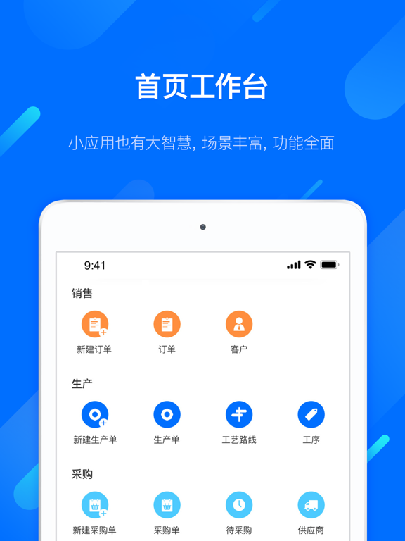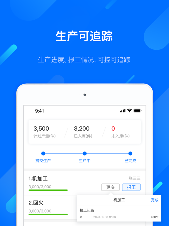 【首页】 可视化统计报表,随时随地查看销售生产情况,待办提醒,快速处理,产销管理就是那么轻松! 【销售管理】 快速创建销售订单,自定义审核。支持一键加入生产,生产进度实时透明,打通生产与销售之间的协同管理,同时具备收货、付款等功能。 【生产管理】 支持按单下达生产任务,任务到人,责任人可快速进行报工操作。生产进度可控可见,轻松实现生产流程管理。 【采购管理】 提供开单、收货、自定义审核等采购管理基础功能。根据生产要求辅助生成待采购列表,为采购人员下单提供指导。 【库存管理】 按业务场景自动生成出入库任务,备料发货更精准。手机盘点,库存管理,得心应手! ERP+MES移动端管理,帮助企业实现生产协同,制造协同,提升企业生产数字化,制造信息化水平,让小微企业管理更简单、更高效!UI细节优化提升使用体验