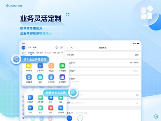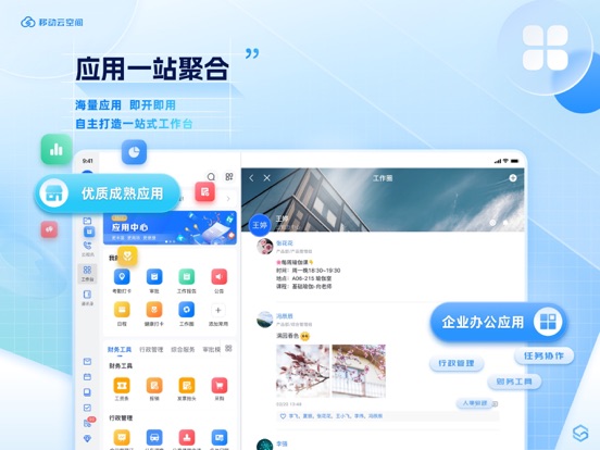 移动云空间,是面向全行业用户提供的一站式企业移动办公与应用聚合平台,以企业协作管理场景为入口,提供云盘、即时通讯、视频会议、文档、日程等基础办公协作工具,并聚合海量应用,让组织沟通更高效、数据管理更安全、企业协作更流畅、业务运转更灵活。 主要功能: 1、组织统一管理,沟通无边界 【统一通讯录】实名可视化的组织管理,架构清晰;新人入职或职位调动,企业通讯录快速更新,相关人员自动入群;人员群组快捷查找,多种查询条件,查询信息全量带出。 【多种通信方式】提供消息、火箭消息、密聊、打电话等沟通方式;发出的消息可查看对方的已读未读状态;紧急重要的事发送火箭消息,应用内强消息提醒、短信实现强触达;开启来电名片识别,高效精准识别来电号码,展示联系人身份信息。 【安全设置】管理员可设置聊天水印防截屏,守护组织沟通的信息安全。 【内外部连接】支持个人免费注册使用,企业添加外部人员为好友,建立外部群,解决跨组织沟通问题,架起企业内外部连接桥梁。 2、围绕云盘,帮助企业打造数据资产中心 【云端管理】数据云端存储,多端同步,随时随地查看,文件、图片、视频在线预览;提供个人盘、群组盘、企业盘,三盘独立;支持企业内部共享和外部链接分享,让分享更简单。 【资产归档】云空间中的聊天文件、邮件、应用文件等数据多维度归档,一键保存至云盘,企业资产快速归档。 【极速传输】文档上传下载不限速,一键秒传,超大文件存储无忧。 【文档协同】提供文档的多人在线编辑,大幅提高信息搜集、文档协同的工作效率。 【同步备份】支持同步备份,永久保留文件所有历史版本。 【安全管理】严谨可靠的分级权限控制,安全有效的数据加密技术,人工智能的内容审查手段,提供安全保障,让数据无忧。 3、提供多种协作工具,协同办公更高效 【日程】提供通知、提醒、会议和日程四种方式,支持日程协作,允许个人日程开放以及查看同事日程,便于安排工作。 【会议】电脑、手机、Pad多端使用,单会议300路视频稳定接入。会前通讯录便捷选择参会人,预约会议自动创建日程,参会人收到提醒,一键入会;会中支持桌面、应用、白板多种模式共享,荧光笔、笔记等工具直观标记,高效沟通;会后录屏文件快捷保存至云盘。 【邮箱】可绑定多种类型、多个邮箱账号;预置五类邮件标签,多种关键词搜索方式;与IM、日程联动,来件实时消息提醒,邮件中快捷添加日程、发起聊天,重要事项不遗漏。 4、全面的业务流程,企业运转更灵活 【OA应用】考勤、加班、请假等多个人事管理工具,日报、周报、公告、任务等多个协作工具,名片夹、公文、调查文件等多个办公工具。 【应用市场】海量行业成熟应用,低代码应用模板中心,满足企业各类业务场景,即开即用。 【自定义业务】低代码工具让企业根据自身需求搭建独有的数据表、审批流,业务个性化。 【开放能力】提供丰富的API接口,支持企业自建应用接入。 5、一站聚合工作台,大大提升工作效率 【工作台】提供专注、应用等多种模式,用户随意切换,汇聚所有企业应用,包括基础办公应用、应用市场应用、企业自建应用。 【专注模式】将重要业务入口合而为一,统一显示待办提醒,不怕遗留领导信息及关键通知。 【自定义】支持企业和个人自定义工作台,随心调配。 6、更多功能与服务 【服务号】企业内宣、文化建设的阵地,企业自建服务号,图文化配置,推送通知统一聚合。 【工作圈】提供员工交流互动的平台,提升团队凝聚力。 【知识库】提供知识管理和学习服务,大量免费书籍,分类齐全。 【云笔记】多种笔记类别,数据云端实时同步,支持历史版本回溯。 联系我们 邮箱:ecpan@cmecloud.cn 如有任何问题和建议,欢迎通过邮件与我们联系 云聚价值 纵享空间修复部分已知问题