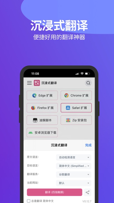 AI 驱动双语网页翻译,如母语般流畅阅读任何语言的网页。 支持在 Safari 中作为扩展插件使用。 「沉浸式翻译」 可以免费使用,无广告。希望大家能轻松、愉悦、优雅地获取互联网上丰富的外文信息,不让语言成为障碍。全平台支持。 支持多项 AI 翻译服务。 【扩展插件功能特性】 • 沉浸式阅读外文网站 - 通过智能识别网页主内容区域并进行双语对照翻译,沉浸式翻译提供了全新的外文阅读体验,因此得名“沉浸式翻译”。 • 深度定制优化主流网站翻译,针对 Google、Twitter、Reddit、YouTube、Facebook、彭博社、华尔街日报等主流网站翻译进行优化,无论是搜索、社交还是获取资讯,都更加流畅高效; • 沉浸式刷视频 - 通过AI赋能,支持Youtube, NetFlix, Coursera等数十家主流视频站的双语字幕翻译。 • 网页输入框翻译,在任何网页上的输入框输入你的母语三连击空格,立即将你输入的内容翻译成你所设置的目标语言,立刻解锁跨语言谷歌搜索等工具的双语实时对话体验; • 高效的文件翻译 - 一键导出双语电子书,同时支持 PDF、字幕、TXT 等文件的实时双语翻译。 • PDF翻译(保留原文档格式排版),进阶版更是支持PDF中的各类复杂的公式识别、表格识别、图片OCR识别,最大限度的保证译文保持原文格式排版,适用场景包括但不限于:外文文献PDF翻译,论文PDF翻译,产品说明书PDF翻译等; 【使用条款】 [https://www.apple.com/legal/internet-services/itunes/dev/stdeula/](https://www.apple.com/legal/internet-services/itunes/dev/stdeula/) 【自动订阅服务说明】 付款:用户确认购买并付款后计入 Apple 账户 自动续费:Apple 账户会在到期前24小时内扣费,扣费成功后订阅周期顺延一个订阅周期 关闭服务:您可以在苹果手机“设置” --> 点击“Apple 账户”-->点击“订阅”,管理自动订阅服务,如需取消,每个计费周期结束前24小时关闭即可,到期前24小时内则不再扣费功能特性如下:修复了一点体验问题