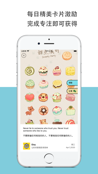 iDay,开启一段美好的专注时光。 为什么需要iDay? - 总是被各种琐事和诱惑打断,无法长时间专心投入 - 因为拖延和懒惰,明明很多事情,却无法开始 - 时间无情流逝,不知道如何开始新的一天 - 试过很多时间管理法,却依然效率低下于事无补 - 事情越来越多,时间越来越少,压力越来越大 - 长时间伏案工作,忘记舒展身体、忘记喝水 如果你有以上困扰,试试「iDay」,让你暂时放下手机,开启你的专注旅程。 iDay是什么? 「iDay」是一个让你可以暂时放下手机、专心投入的 App。每当你想开始一段专心投入的时光,你可以在「iDay」中选择一个任务并开始专注。接下来的时间里,伴着海浪、雨声、森林、冥想或是咖啡厅的环境声音,你会心无旁骛专心投入。之后,你可以休息一小会儿或是继续下一段专注。每一天,都有成千上万的人在iDay开启专注旅程,和时间做朋友,遇见更好的自己。 「iDay」的主要功能 - 基于番茄工作法,每次专注 25 分钟,间隔休息 5 分钟 - 支持时长与休息模式自定义,定制顺心顺手的专注计时器 -任务提醒 ,定时任务提醒,培养专注习惯,摆脱拖延症 -学霸专区,开启学霸模式、翻转模式,让你在专注的时候更好地远离手机 -数据统计 让你的努力有迹可循 成为更好的人的路上,偶尔会孤单也偶尔会枯燥,希望我们一起度过,一起成长。What's New: - 修复一些bug