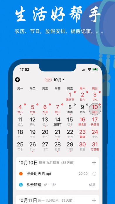 AppStore多次推荐的五星级日历应用! 用户评论: by 股彩民 :Simple the best 局面清爽 启动快 功能实用 干净利落的好软件,强烈推荐,6星! by 守护在你左右:不错,简单好用,没有太多杂七杂八的附加功能! by @muz:很好,我从第一版用升级到现在。伴随着我三四个年头,一直不错!这些年都在用,赞!!用的方便,比以前进步!再接再厉! 自动续费会员说明 1、服务名称:生活日历1个月会员自动续订 2、订阅周期:1个月 3、订阅价格:9元/月 4、付款:通过用户的iTunes账户扣款,用户确认购买后即付款。 5、续订:苹果iTunes账户会在到期前24小时内扣费,扣费成功后订阅周期顺延1个订阅周期。 6、取消续订:如需取消续订,打开苹果手机“设置” --> 进入“iTunes Store 与 App Store”-->点击 “Apple ID”,选择"查看Apple ID",进入"账户设置"页面,点击“订阅”,选择生活日历会员取消订阅即可。如未在订阅期结束的至少24小时前取消订阅,此订阅将会自动续订。 7、会员服务协议:https://shenghuorili.com/post/5257.html 8、隐私协议:https://shenghuorili.com/post/4381.html全面适配iOS26