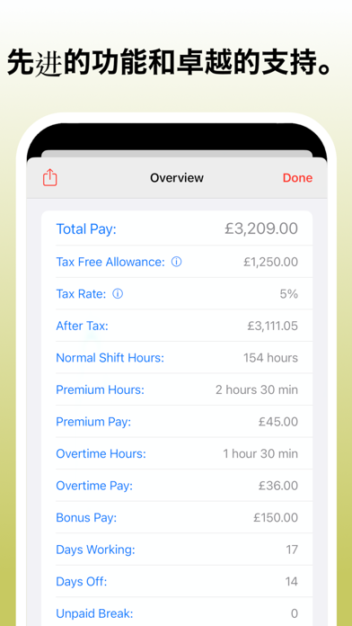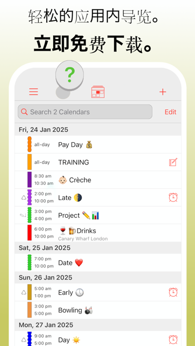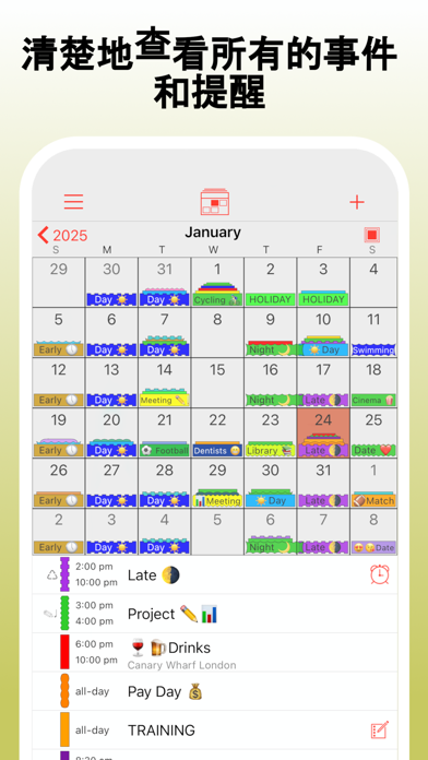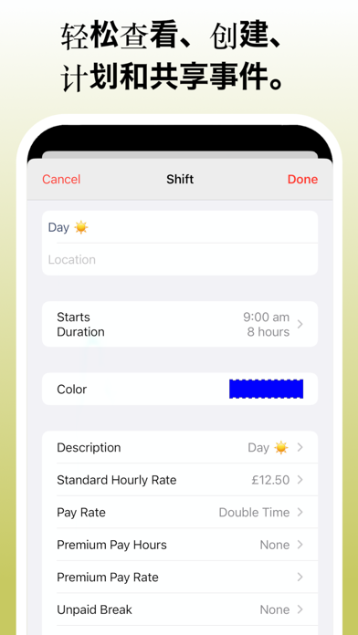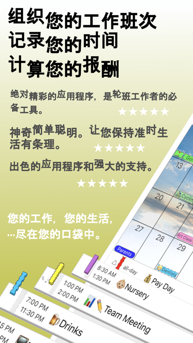 -- 立即免费试用SHIFTLIFE-- ShiftLife 是专为轮班工作者设计的日历应用程序。 - 安排班次。 - 记录工时。 - 计算报酬。 ShiftLife清晰简单地显示即将到来的班次、培训日、假期、待命日及其他重要活动。 除了让您规划未来的工作及娱乐,ShiftLife也可让您轻松记录您完成的班次、加班时间、工作地点、时薪,总薪酬、病假和其他细节。 ShiftLife的界面简单易用,便于快速直观操作,其功能设计特别易于使用。它将很快成为您不可或缺的软件之一。 功能: * Apple Watch *通知中心的widget * iPhone、iPad、iPad mini、iPad Pro。 * iCloud、Google、Outlook、Yahoo、iCal Sync。 * 快速输入班次。可以在几秒钟内完成全年的班次。 * 添加、删除、编辑日历。 * 灵活处理任何工作模式。 * 用蓝牙与您的同事和朋友同步日历和班次模式。 * 显示日历月照片。 * 您的照片导入自己的图像。 * 自定义事件、病假、节假日、培训日。 * 多个日常事件和班次。 * 清单、日、周、月视图。 * 友好的用户界面,直观的触摸手势。 * 节假日日历。 * 使用.ics文件导出/导入您的事件与班次。 * 创建月视图照片用作您的手机壁纸。 * 可将您的日历照片发送给朋友。 * 将任何一天设为工作周的开始。 * 个性化您的显示。 * 电子邮件发送您的班次。 * 支持iCloud日历,在您的设备之间进行自动同步。 * 西班牙语、法语、德语、俄语、意大利语、葡萄牙语、汉语、日语、韩语。 -- 工作生活,尽入囊中 -- _____________________________________ - 这不是一个免费的应用程序。免费下载精简版,看您是否喜欢它,然后再决定是否购买。除了含有广告和对可以创建和加入到您的日历的事件数量做了限制以外,精简版提供全部功能。可以购买应用程序内小升级以移除限制和广告。首次升级订购的完整版本,会包含完整的当年和次年日历。会以应用程序内小额购买方式提供此后的日历年份。在要求确认任何应用程序内购买之前,总会以您的本地货币方式显示费用。为了让用户进一步定制应用程序以满足其特定需要和喜好,还会有 SchedJoules 提供的称为“Calendar Store”的附加组件。它包含重大节日、体育赛事、天气和生活日历的众多集合。可以设置这些日历,让它们和您的其他个人日历活动一起显示。您可以使用每年自动续订方式购买 1 年的“Calendar Store”附加组件访问权限。您可以获得完整和持续使用的“Calendar Store”访问权限,包括实时更新。“Calendar Store”附加组件的 1 年订用起步价是 $1.99(不同地区,价格可能不同),可以免费试用一个月,因此您可以在购买之前试用。免费试用 1 个月之后确认购买,会从您的 iTunes 帐户扣除费用。附加组件订用会自动续订,除非在当前订期结束前至少 24 小时关闭自动续订。不允许取消当前有效的订用期。您可以在您的 iTunes 帐户设置中管理您的订用,并随时关闭“Calendar Store”附加组件的自动续订。www.ovalkey.com/terms-of-service 和 www.ovalkey.com/privacy-policy 上分别有完整的服务条款和隐私策略。 ____________________________________ 评论: "使我的生活轻松许多" 澳大利亚 ***** "包含我所寻找的手机日历的一切功能" 美国 ***** "精彩绝伦的应用程序,要是早发现就好了!是轮班工作者所必需的。" 英国*****完全兼容最新的 iOS 和 iPadOS。