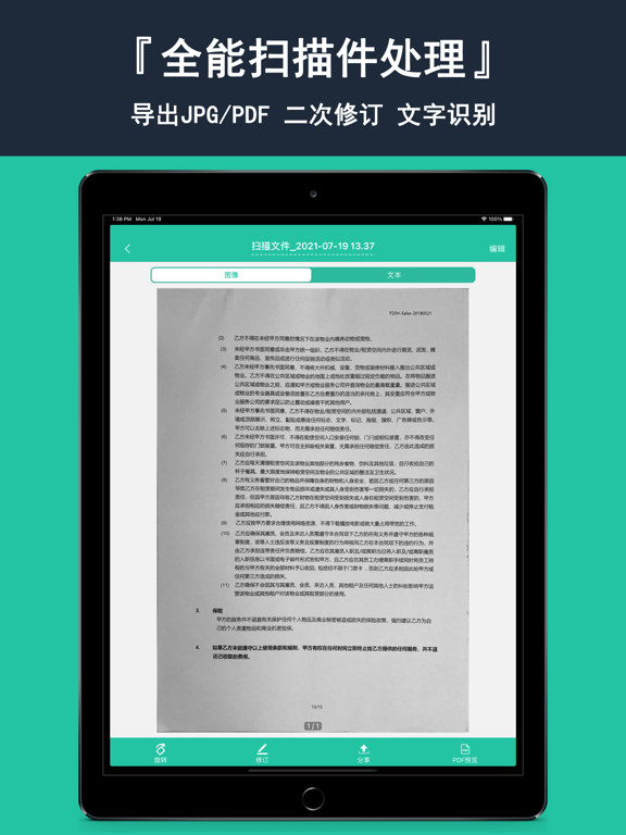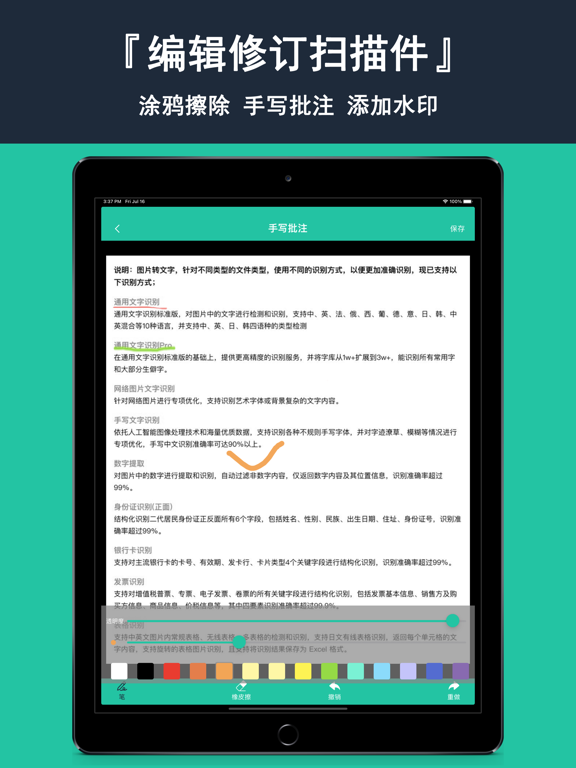 全能扫描仪,效果媲美千元扫描仪的商务软件,同时拥有高精度图片文字提取功能,专业扫描软件。快速扫描文档、卡证(身份证等)、名片、相片、图片等,智能生成标准扫描件、精准文字识别、拍照翻译、PDF编辑修改导出一气呵成! ——【应用特色】—— 【自动切边】360度拍摄,照样精准自动切边,去杂乱背景! 【高清扫描】极速生成高清文档扫描件,无纸化文件保存! 【多种文件】生成彩色/黑白/灰度/怀旧等扫描件。 【二次编辑】扫描件二次修订(涂抹擦除,手写批注,水印添加) 【便捷导出】扫描件/照片便捷导出JPG/PDF。 【拼图功能】证件、发票、习题、漫画拼到一张纸上。 【文件安全】文件加密扫描和处理,无需担心隐私泄露。 【文件管理】文件夹分类管理,超便捷增删改查! 【文字识别】扫描件图片,高精度文字识别扫描并复制/导出。 【文字处理】支持扫描结果翻译或导出txt/pdf/Word文件。 使用您的 iOS 设备扫描、打印以及管理文档吧! 仅使用您的 iPhone 就可以立刻扫描和打印任意书面、印刷或图形材料,包括: — 给你合作伙伴或客户的合同; — 名片; — 收据来跟踪你的支出; — 纸质笔记和心智地图来保存最好的想法以供备查; — 书本页面和文章以供今后阅读和分析; — 不提供数字拷贝的文本; 【自动续费VIP套餐说明】 - 订阅周期:1个月/购买1月(连续包月),12个月/购买1年(连续包年)。 - 订阅价格:连续包月价格为每月25元,连续包年价格为每年98元。 - 订阅付款:自动续费商品包括“连续包月/连续包年”,用户确认购买并支付后记入 iTunes账户。 - 订阅续费:您的会员到期前24小时,苹果公司会自动为您从 iTunes账户扣费,成功后有效期自动延长一个周期,如您未取消订阅,苹果公司会在扣费期内不定期尝试扣款,请及时关注订阅及扣款情况。 - 取消续费:若需取消自动续费,请在当前订阅周期到期前24小时,进行取消操作。 - 取消方法:您使用苹果ID开通的自动续费产品,在“设置” - “iTunes Store与App Store” - “Apple ID” - “查看Apple ID” - 在账户设置页面点击“订阅” - 取消全能扫描仪自动续费VIP订阅即可。 【非续费VIP套餐说明】 - 周期:一次性买断VIP/永久VIP(一次购买永久有效) - 价格:一次性买断VIP/永久VIP价格为168元。 - 付款:商品包括“一次性买断VIP”,用户确认购买并支付后记入 iTunes账户。 - 退款:您可以访问如下网址,参考其中信息先前往App Store取消订阅。https://support.apple.com/zh-cn/HT4098 取消后,如需退款,由于苹果未授权开发者查看苹果账户信息。如果您是在中国大陆注册的苹果帐号,可以通过AppleID中的订单直接办理退款。 - 全能扫描仪隐私协议:http://www.528529.com/apphtml/1366265585_ys_cn.html - 全能扫描仪服务协议:http://www.528529.com/apphtml/1366265585_tk_cn.html - 联系邮箱:app20190304@qq.com1、优化修订的涂鸦擦除 2、修复切边调整放大镜 3、修复切边后失效问题 4、优化证件保存A4结果 5、修复识别后翻译错误 更多细节优化等你来体验