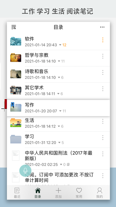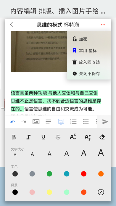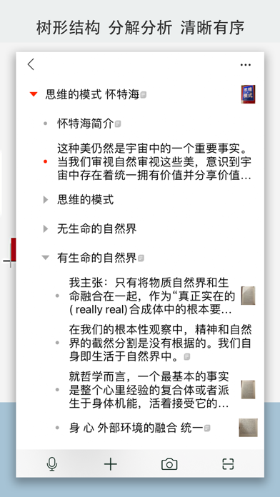 树形结构,清晰有序,整洁直观,灵活简便。利于笔记长久积累,利用和查阅,提高笔记的效益。 【功能特点】 1. 用于生活、工作、学习、阅读笔记。 2. 树形结构,无限分层,分析分解知识、思想、事情,清晰直观。 3. 笔记可灵活、方便地移动、组织到树结构,保持笔记、知识的结构、整洁、清晰、有序。 4. 长久积累也不会堆积杂乱,可显著提高笔记的积累、利用效益。 5. 云备份、多终端同步,加密传输存储,他人也无法查看。 6. Windows端自由导出,多种格式。 7. 比思维大纲灵活丰富,比一般笔记结构整洁有序,宜于查阅。改正偶尔拍照白屏bug
