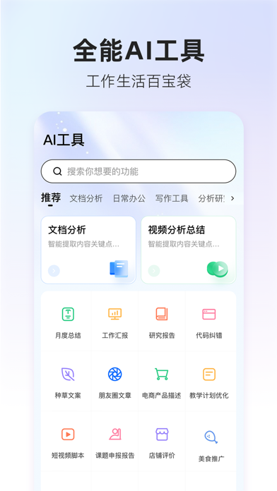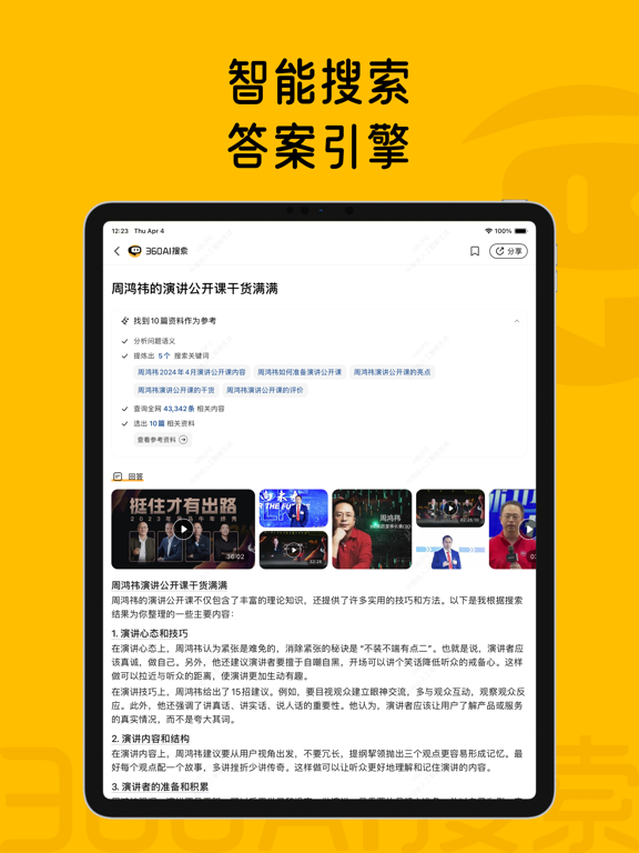 360AI搜索—— 什么都能问,什么都能答;没有不会答,只有你没问! 你来提问,剩下的工作交给我! 全新上线AI助手,整合国内十余家主流大模型,让您一站式体验多家大模型。 帮您高效总结、AI搜索、智能分析、精准翻译,还能进行写作和制作PPT,是您工作和生活中解决问题的多面手。 ●【帮你找】 从此和缓慢的逐页筛选答案说拜拜! 360AI搜索大模型不仅能做到快速匹配全网优质内容; 并总结好全网高质量、可溯源、够深度的答案; 还能输出思维导图,一图整理重点! 不用1分钟,让你成为朋友圈里“百晓生”。 ●【帮你理】 100页的文档,10万级的文字;只需1分钟,精炼1张图。 360AI搜索特色脑图功能,输出不光是图,更是逻辑、决策辅助; 让知识点瞬间浮现,快速获得核心认知! ●【帮你看】 视频太长不想看?2倍速也觉得慢? 360AI搜索特色功能,AI帮你60倍速看! 1分钟提炼1小时视频要点,1分钟完成你小时级的工作; 高效节约你宝贵时间! 联系我们: 360AI搜索持续进化中,如使用过程有任何问题,请在“我的-问题反馈”中联系我们,360AI团队绝对重视您的意见与建议,并会快速反馈问题。修复线上已知问题