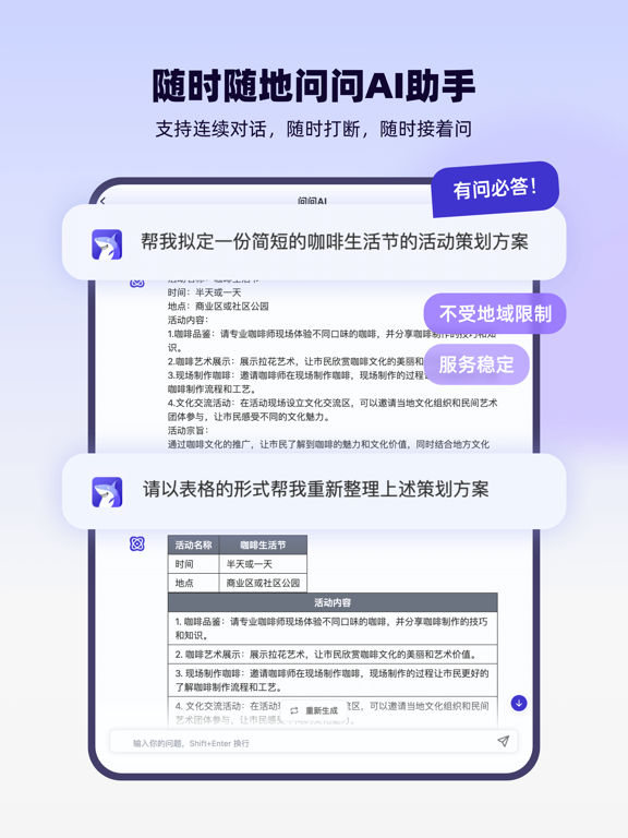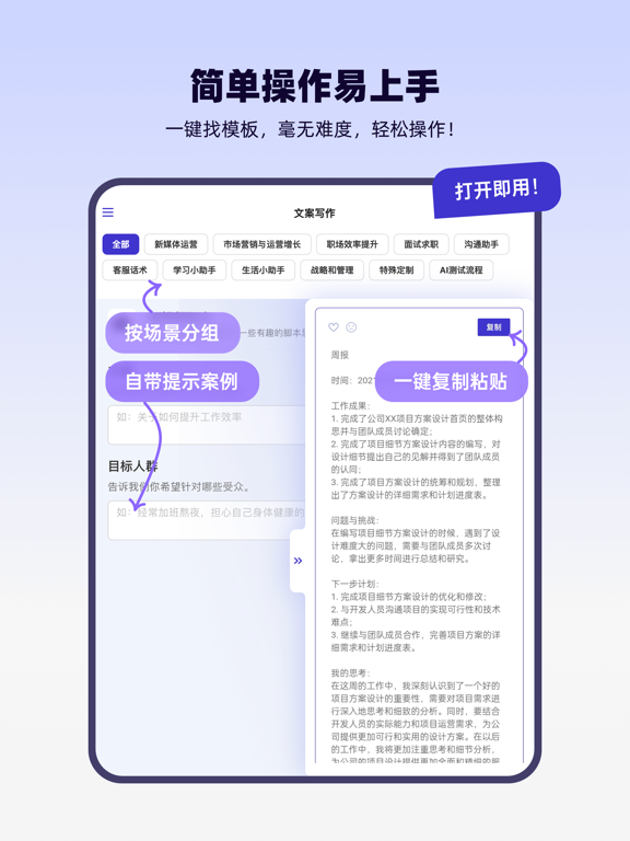 ·支持AI连续对话聊天,帮你解答各种疑问... ·让AI帮你画思维导图写文案,提升工作效率... ·内置多场景专业模板,输入提示一键生成内容... “轻松鲨”是一款基于人工智能技术的AI助手,你可以像和朋友聊天一样与AI对话提问,并即时获得专业且高质量的答案。不仅如此,轻松鲨还提供了包括新媒体运营、市场营销、职场沟通、面试求职、电商客服、校园学习、语言翻译、生活情感、企业战略管理等超多行业的丰富文字模板以及思维导图模板,用户只需输入部分信息,即可轻松高效完成创作,大大节省时间和精力。 【与AI对话,像聊天一样简单】 ·写你所想,生成万物:文章、代码、报告、方案、邮件、简历、翻译....... ·支持AI连续对话,随时打断,随时接着问 ·支持创建多个会话主题,可根据情境或历史记录多次提问,AI上下文接续回答 ·无门槛无限制,打开即用的AI助手,安全稳定又顺滑 【内置AI文字和思维导图模板,创作只需指尖轻点】 ·AI模板覆盖各行各业:新媒体运营、市场营销、增长运营、职场效率提升、沟通助手、面试求职、电商客服、校园学习、语言翻译、生活情感、企业战略管理等 ·AI模板由专业团队制作编排,点开即用,根据步骤和框架输入信息即可自动生成准确内容 ·AI模板随时更新与优化,保证模板库的丰富度、新鲜度以及适配度 【热门功能】 ·问问AI:与AI聊天对话,让AI帮你解答各种疑问 ·思维导图:AI帮你梳理逻辑搭建体系,一键生成清晰脑图 ·小红书笔记:生成小红书风格的笔记文案,自带丰富emoji ·爆款标题:根据笔记内容,生成多个吸引读者的笔记标题 ·短视频脚本:为短视频拍摄提供一些有趣的脚本思路 ·日报周报生成器:工作进展和计划等信息的总结汇报 ·改写简历:根据STAR原则,写好简历中的工作经历 ·命题作文:根据你的命题要求,撰写文章 ·回复女朋友:帮助你高情商回复女朋友说的话 ·SWOT分析:分析产品/企业面临的优劣势、机会和威胁 ....... 解放创作灵感,AI助力精彩,轻松鲨的强大远远不止这些,一起来探索AI的无限可能吧!新增语音提问功能