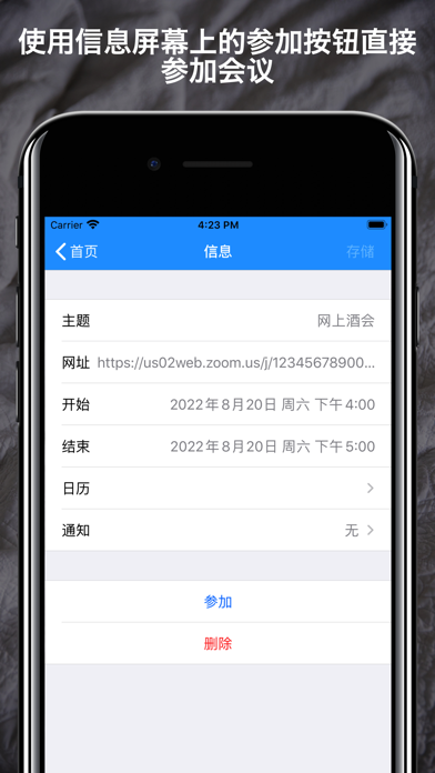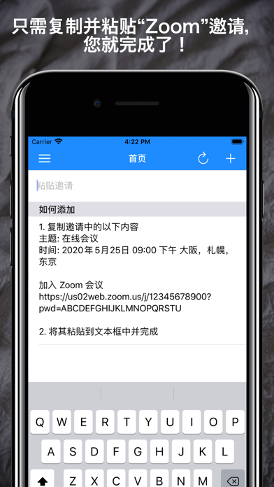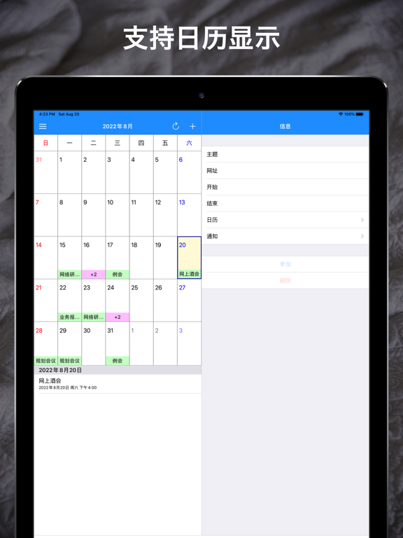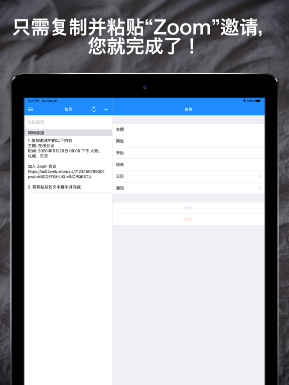 [在线会议时间表] 简化会议管理,革新工作流程 在线会议日程安排大大减轻了管理会议的烦恼。只需从电子邮件或消息中复制粘贴邀请详情,即可高效管理您宝贵的时间。这款专业人士必备的应用程序提供智能日程管理和一键会议接入。 • 主要特点 [直观的事件添加]:只需粘贴Zoom邀请,即可自动分析主题、时间和URL。 [多平台支持]:轻松注册包括Google Meet和Skype在内的各种会议系统。 [智能URL提取]:自动检测并将URL反映到您的日程中。 [便捷的提醒功能]:按照您设定的时间通知会议开始和结束时间。 [一键加入会议]:通过通知或应用程序内的单次点击即可立即加入会议。 [无缝日历集成]:自动与标准日历和Google日历同步,消除重复管理。 [一目了然的会议列表]:按时间顺序组织的会议列表,方便快速查看日程。 [随处访问]:通过iCloud同步数据,实现多设备无缝日程管理。 • 使用方法 1. 只需粘贴邀请即可添加事件 只需复制粘贴如下邀请详情,事件就会自动添加: 主题: 在线会议 时间: 2024年5月25日 09:00 下午 大阪,札幌,东京 加入 Zoom 会议 https://us02web.zoom.us/j/12345678900?pwd=ABCDEFGHIJKLMNOPQRSTU 2. 一键加入会议 只需点击通知或会议信息界面上的"加入"按钮。 不再需要费力搜索会议URL。 简化您的在线会议管理 使用在线会议日程安排,管理会议变得前所未有的简单。 大大简化输入邀请详情的流程,使会议参与更加顺畅。 更高效地管理您的日常在线会议。 立即下载,开始智能会议管理!・广告免显示期限延长修复:改进了广告免显示期限的延长方式,使其从当前日期正确延长 我们将继续根据您的反馈改进应用。 如果您有任何意见或建议,请通过应用内反馈功能或App Store评论告诉我们。