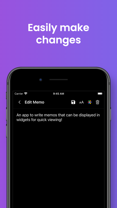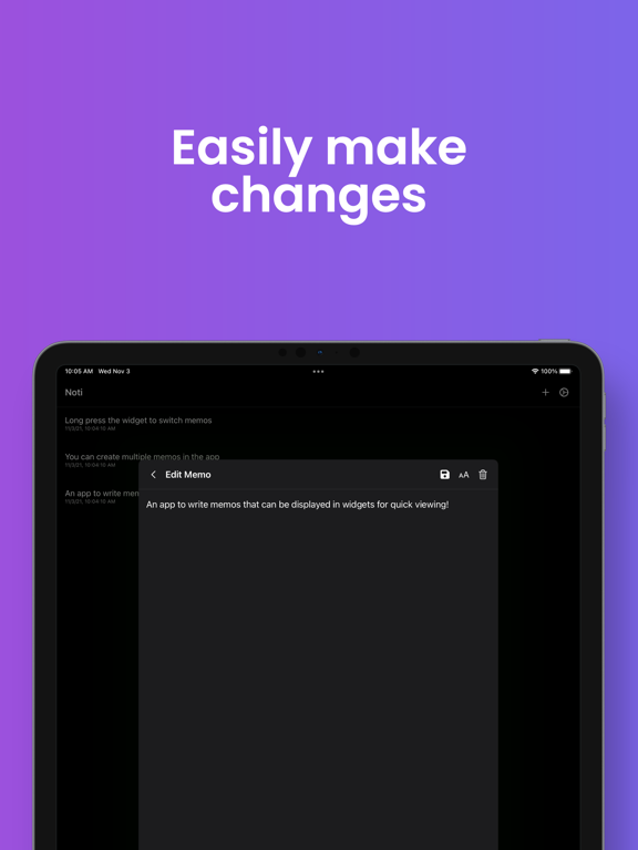 你已经厌倦了解锁智慧型手机就只是为了要显示备忘录吗? 我们有一个解决办法!用 Noti 写下来的备忘录可以用小工具来显示! App 的特征 - 可以简单写下备忘录 - 可以迅速储存 - 可以用小工具显示 - 自动保存(高级功能) - 更改字体大小(高级功能) - iCloud 同步(高级功能) 个人隐私条款: https://sites.google.com/view/noti-app 使用规约: https://sites.google.com/view/noti-terms- Minor bug fixes and improvements.
