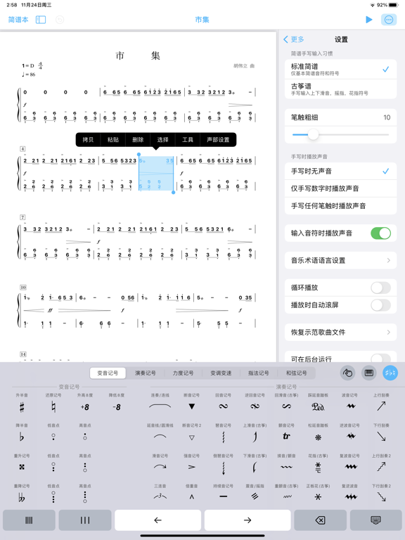 简谱本是一个专业且极具效率的简谱制作工具,得益于它的手写识别与自动排版功能,能让您快速地制作出排版专业、工整美观的简谱音乐作品。 简谱本APP几乎支持所有的简谱元素: 基本音符、附点音符、升降音、前倚音、后倚音、三连音、多连音、圆滑音、和弦、琶音、颤音、断音、震音、波音、回音、力度记号、变速记号、变调记号、多种拍号、反复记号、跳跃记号、和弦标记、多行歌词、各种连线... 完美支持古筝的各种演奏记号:上滑音、下滑音、回滑音、揉音、颤音、摇指、花指、板前花、正板花、刮奏、扫弦... 专业的简谱自动排版功能,排版参数可调, 小节排列密度、字体、字号、行距等排版细节均可按用户喜好进行调整。 除了App内置的88种音色以外,您还可以使用自己的音色文件(.sf2), 将sf2文件拷贝到SoundFonts目录下即可在应用中调用该音色。 支持导出多种文件格式: PDF,MIDI,PNG,M4A压缩音频、WAV无损音频。• Bug fixes.