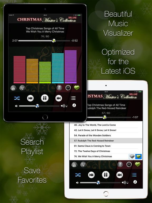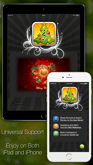 * 欧美乐坛最好听的圣诞节歌曲音乐大合辑! * * 近百首世界经典假日名曲英文原唱! * 圣诞节就要来临了, 在这欢乐热闹的日子里, 圣诞歌曲必不可少。欢快的, 伤感的, 适合小朋友的, 适合恋人的, 在这个圣诞金曲大合辑里, 寻找你喜欢的圣诞歌曲吧! 《圣诞音乐歌曲精选集》为世界经典名曲系列之假日精选 - 精挑细选出来的80首圣诞歌谣和假日金曲! 为您带来惊喜温馨的圣诞氛围! 从圣诞派对, 到新年音乐会, 从流行爵士乐, 到百年民歌谣… 您会发现这些欢快的假日音律耳熟能详, 经典永恒, 无所不在。《铃儿响叮当》, 《平安夜》,《白色圣诞》,《圣诞老人进城来》… 让这些经久不衰的经典圣诞欢歌伴随您度过这个冬天吧! * * 软件功能 * * ============== - 线下欣赏, 不用联网 - 彩色视觉展视器音乐动态 – 欣赏有如音乐会中的演奏动感! - 精彩音乐影视 - 优酷视频 - 英文歌词链接 - 收藏夹播放列表功能 - 睡眠计时器功能 - 支持: 后台播放, 远程控制, 屏幕锁定时控制 - 随机播放, 单曲重复, 循环播放全部曲目列表 - 触屏控制音乐: 双击屏幕 - 播放/停止音乐, 左右触摸 - 转换音乐 - 支持音响, AirPlay, 遥控, 蓝牙耳机, 怎么听都可以! - 升级一次, 即可多次免费升级, 在iPad/iPhone/iPod上兼容享用 * * 曲目 * * 80首经典, 流行, 世界圣诞名曲英文原唱: ======================== * All I Want for Christmas is My Two Front Teeth * Angels We Have Heard On High * Auld Lang Syne * Ave Maria * Baby's First Christmas * Because It's Christmas * Blue Christmas * Carol of The Bells * Christmas is All Around * A Christmas Long Ago * The Christmas Song * Deck The Halls * Driving Home For Christmas * Feliz Navidad * The First Noel * Frosty The Snow Man * Give Love On Christmas Day * Grandma Got Run Over by a Reindeer * Happy Holidays * Have Yourself A Merry Little Christmas * Here Comes Santa Claus * Hey Santa * Holiday For Bells (Instrumental) * A Holly Jolly Christmas * I'll Be Home For Christmas * If It Doesn't Snow on Christmas Day * It's Beginning to Look A Lot Like Christmas * It's Christmas Once Again * It's Gonna Be A Cold, Cold Christmas * It's The Most Wonderful Time of The Year * Jingle Bell Rock * Jingle Bells * Joy to The World, The Lord is Come * Last Christmas * Let It Snow, Let It Snow, Let It Snow! * The Little Drummer Boy * Lonely This Christmas * A Marshmallow World * Mary's Boy Child * Mele Kalikimaka * Merry Xmas Everybody * O Christmas Tree * O Come, All Ye Faithful * O Holy Night * O Little Town of Bethlehem * Parade of the Wooden Soldiers * Please Come Home For Christmas * Rockin' Around The Christmas Tree * Rudolph The Red-Nosed Reindeer * Santa Baby * Santa Bring My Baby Back * Santa Claus is Coming to Town * Silent Night * Silver Bells * Sleigh Ride * Suzy Snowflake * Thank God It's Christmas * This Time of The Year * The Twelve Days of Christmas * Warm December * We Wish You A Merry Christmas * White Christmas * The White World of Winter * Winter Wonderland … ====== 用户帮助 ====== 联系客服: xmas@magicanywhere.com =================== [ 提示 ] 下载此免费程序, 将能试听全80首乐曲经典片段, 浏览曲目, 帮助您识别世界圣诞歌曲经典! 若您喜爱软件及曲目, 可由程序内部升级到完全版, 带给您优美地完整全长播放。 > 如果您购买过完整版, 因为任何原因又回到了免费版(片段音乐), 用同一帐号再次免费升级就可以了(点击金额不会被再次扣钱)! 在多台设备 (iPod, iPhone, iPad) 上升级到完整也是免费!Apple 已更新此 App 以显示 Apple Watch App 图标。 - 修复 iOS 11 上无法运行的问题。 - 改进了“加入我的最爱”的功能。