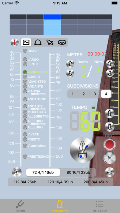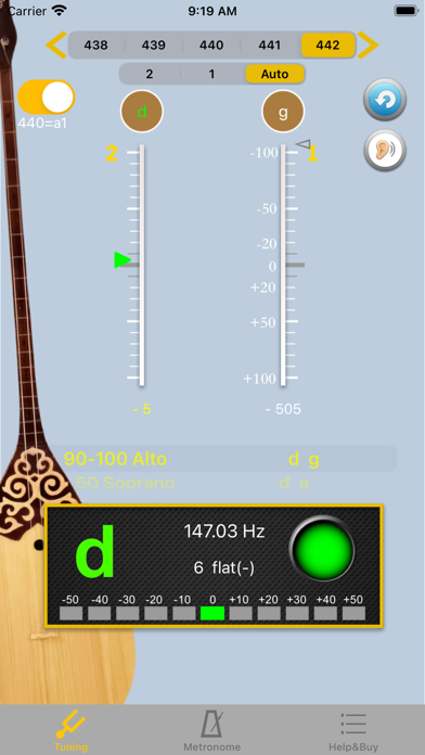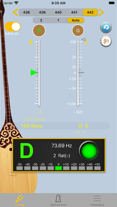 功能說明: ▪ 鋼琴音校音 : 點擊精刻度尺上方的空弦音名圓形按鍵, 發出相應鋼琴音, 供校音用. 鋼琴音為十二平均律, 442Hz. ▪ A4 頻率調整 : 開啓 428~452 A4頻率切換功能. 使用畫面上方, 左右兩邊箭頭. ▪ 刻度尺 : 畫面上2根弦刻度尺, 正中央線為空弦音準位置, 綠色三角箭頭指向此, 表示調音准了. 刻度尺每格為10分位(cents), 超出範圍時, 綠色三角箭頭變成暗灰色. 刻度尺下方會顯示音分差, +號代表高, 請調鬆弦, 反之 -號代表低, 請調緊弦. ▪ 顯示面板 : 顯示相近音名(白色), 音準時, 音名會變成綠色, 調音正確時, 會出現綠色燈號, 下方的LED也會相應移動, 顯示高低10cents(分位)情形. 更視覺化.- 不同屏幕尺寸设备、用户界面和显示比例优化 - 节拍器增加录音功能和3组常用设置 - 错误修复