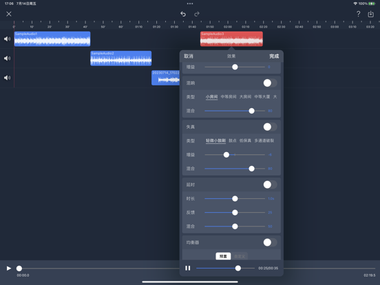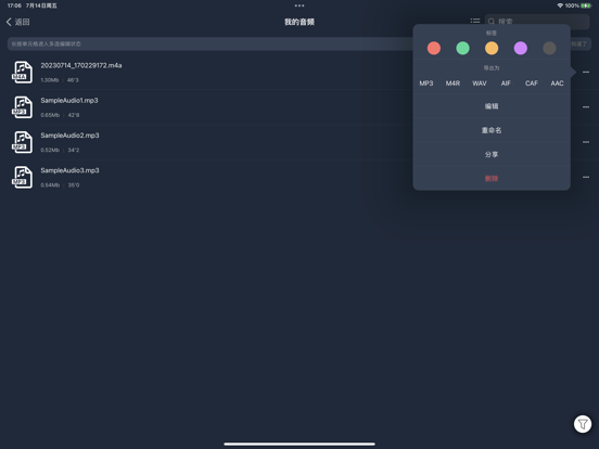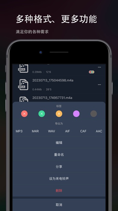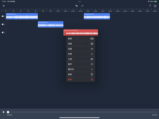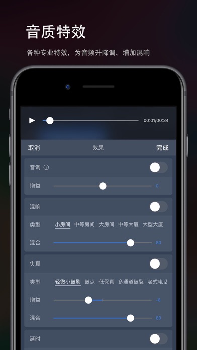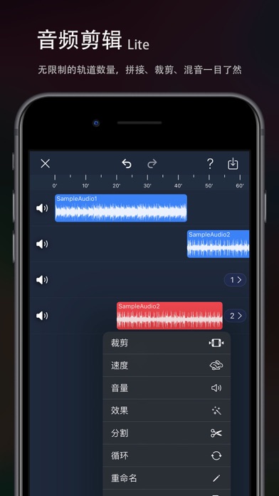 【音频剪辑Lite】一个干净的用户界面和强大的音频编辑工具。 可以在iPhone和iPad上轻松完成专业音频剪辑工作。 【剪辑】 -「拼接、混音」:一键切换;同时支持自由拖动,简单易操作 -「录音」:支持从有线耳机(Earphones)或者无线耳机(AirPods、Pro)耳返;支持伴奏播放; -「裁剪」:快速自由裁剪音频 -「变速」:0.2倍至4倍,节奏快慢自由掌控 -「平衡」:支持设置左右声道 -「渐变」:1秒至5秒,淡入淡出随心设置 -「循环」:循环音频填充至合适的长度 【效果】 -「音调」:升调、降调,一秒变“声”萝莉、大叔... -「混响」:房间、客厅、教堂...各种场景任你切换 -「失真」:电音、回声、金属...感受不一样的音频 -「延时」:最长支持2秒延时特效,单人也能实现合唱 -「均衡器」:低音增强、人声共鸣... 更有自定义均衡器,10段频率,让你的音频人声清澈,高音通透,低音“动次打次” 【特色】 -「设为铃声」:轻松将音频设置为手机来电铃声 -「格式转换」:支持mp3、m4a、m4r、wav、aiff等音频格式自由转换 -「导入音频」:支持6种导入音频的途径:视频提取、WiFi、UTI、Apple music、文件、粘贴板 -「自动草稿」:自动保存草稿,重新编辑更高效 -「撤销/重做」:支持无限次的撤销和重做 -「标签分组」:设置颜色标记,将音频轻松分组 -「删除撤回」:删除音频后提供“后悔”操作 【联系我】 Gmail:chentom417@gmail.com 您的建议对我非常重要,您可以使用app内的“反馈”与我联系。 自动续费声明: 1.付款:"连续包月/年"商品为自动续费商品,确认购买后,会从您的苹果iTunes账号扣费; 2.续费:在您订阅周期到期前24小时,苹果会自动从ITunes账户扣费,成功后"去广告"的有效期自动延长; 3.如需取消自动续费,请在订阅期到期前至少24小时,手动在Apple ID账户设置中关闭自动续费,关闭后不再扣费。 服务条款: http://common.iuuapp.com/terms_service_cnv1_audiolite.html 隐私政策: http://common.iuuapp.com/privacypolicyv1_audiolite.html编辑音频更新: 修复了多个音频可能出现延时; 优化了编辑菜单的显示方式,更利于裁剪、分割; 修复了其他已知问题;