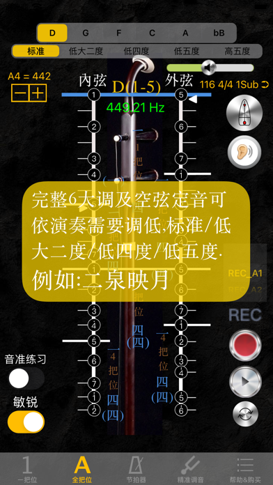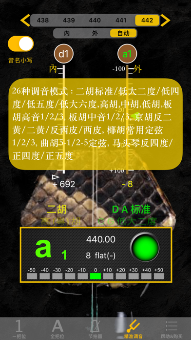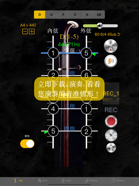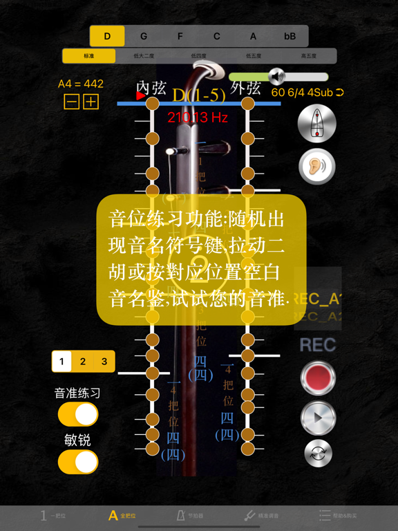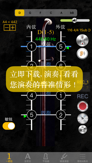 包含1把位 & 全把位音准练习, 节拍器和精准调音, 三大功能. 简洁的使用介面, 图示音准位置, 噪音过滤, 音准显示稳定, 无需任何设定, 打开APP, 演奏时, 自动将音准显示于画面弦上的相对应位置, 比对自己左手按弦位置是否正确, 可以有效提升音准感, 特别是音准感不佳及不熟习把位的学习者. 彻底解决, 左手按弦换把位时, 身旁没老师纠正音准的痛苦. [1把位 & 全把位音准练习] - 支持6种调选择: D,G,F,C,A,bB - 支持A4 频率调整 : 428~452频率切换 - 支持背景节拍声:在节拍器页面设定返回 - 支持录音回放:供演奏者回顾演奏过程中音准问题 - 音准练习:随机在画面中央出现音名符号键,拉动二胡或按内外弦上对应位置空白音名符号键,试试自己的音准 - 空弦音调降变化:标准/低大二度/低四度/低五度,可以演奏“二泉映月” - 演奏时, 可边显示音准, 背景节拍声并同时录音. 帮助演奏者, 同时校准音准和节奏. 初学者不妨试试演奏任一D调曲(例如:田园春色), 感受带给您的帮助. - 使用全把位图, 可以即时反馈左手在琴弦的移动是否到位, 可帮助学琴者, 更好掌握例如:8度跳跃. 对于换把练习也是有一样的助益 [节拍器] - 操作画面直觉简易, 所有功能在同一页面即可设定完成. - 直观的节拍模式选择, 18种, 包含 : Grave 25-45 / Largo 40-60 / Lento 45-60 / Larghetto 60-66 / Adagio 66-76 / Adagietto 72-76 / Andante 76-108 / Andantino 80-108 / Marcia moderato 83-85 /Andante moderato 92-112 / Moderato 108-120 / Allegretto 112-120 / 116-120/ Allegro 120-156 / Vivace 156-176 / Vivacissimo 172-176 / Presto 168-200 / Prestissimo 200 bpm and over - 支持"细分节拍”功能, 双倍,三倍和四倍节拍细分 - 支持自定义节拍设置2组,可以存储和加载 - 支持钟摆显示模式 - 支持程序内音量调节,调节音量更加快捷 - 计时显示 帮助掌控练习时间 - 使用RTP(Real Time Playback)模式,节拍精准,并且支持动态变速换音 - 4种节拍声音可供选择 [精准调音] - 简单设定画面上方的频率及中间的调子, 弹奏, 调音结果即时显于对应的弦位置上. - 支持26种调音模式 : 二胡5 种-标准/低大二度/低四度/低五度/低大六度, 高胡, 中胡, 低胡, 板胡高音1, 板胡高音2, 板胡高音3, 板胡中音1, 板胡中音2, 板胡中音3, 京胡反二黄, 京胡二黄, 京胡反西皮, 京胡西皮, 椰胡常用定弦1, 椰胡常用定弦2, 椰胡常用定弦3, 曲胡5-1定弦, 曲胡2-5定弦, 马头琴反四度, 马头琴正四度, 马头琴正五度 - 校准音 : 点击刻度尺上方的空弦音名按键, 发出相应参考音. - 支持A4 频率调整 : 428~452频率切换. 使用画面上方, 左右两边箭头 - 刻度尺 : 画面上弦刻度尺, 正中央线为空弦音准位置, 绿色三角箭头指向此, 表示调音准了. 刻度尺每格为10分位(cents), 超出范围时, 绿色三角箭头变成暗灰色. 刻度尺下方会显示音分差, +号代表高, 请调松弦, 反之 -号代表低, 请调紧弦 - 显示面板 : 显示相近音名(白色), 音准时, 音名会变成绿色, 调音正确时, 会出现绿色灯号, 下方的LED也会相应移动, 显示高低10cents(分位)情形. 更视觉化. 期望能成为学习者,老师不在身旁,自学时的好伴侣.让您的学习过程更加愉快,我们会努力为大家做出更多好用的音乐应用,感谢大家的支持. 欢迎以e-mail联系我们.- 错误修复与升级
