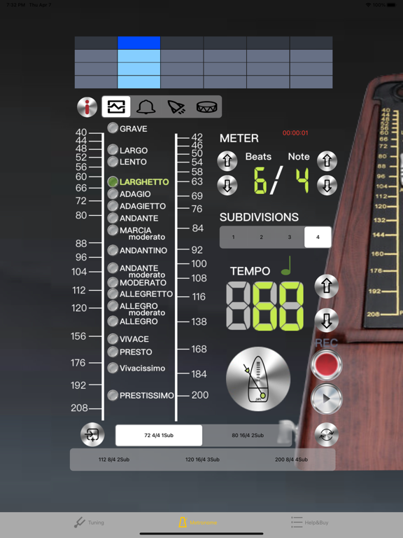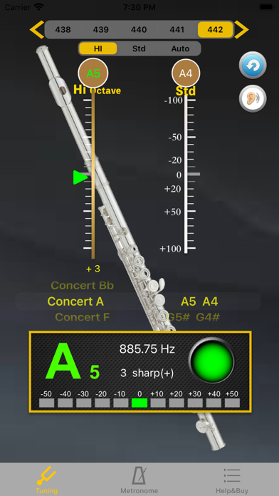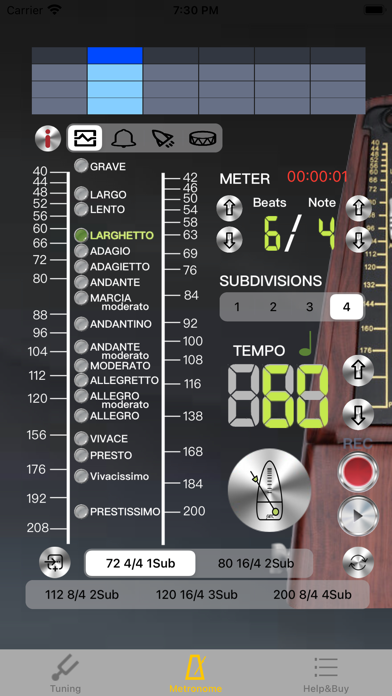 包括Concert A / Bb / F选项。 具有自动噪声过滤功能的最简单,最精确的调谐APP。 第一步是在屏幕顶部选择频率,然后在屏幕中间选择调谐。演奏乐器时,音高将通过指示信号高或低显示在面板上。 [调音器] -A4频率调整:为A4弦选择428〜452频率。 -精确调整的标度是每个子位10美分。绿色箭头表示音高准确,一旦音高差超过一个子位,它将变成白色。 -完整的功能,通过点亮绿色或白色,可以直观地告诉您音高好坏。用户可以通过刻度上显示的照明箭头轻松调整弦。 [节拍器] -操作屏幕直观易用。所有功能都可以在同一页面上设置。 -直观的节拍模式选择,共有18种类型,包括:Grave 25-45 / Largo 40-60 / Lento 45-60 / Larghetto 60-66 / Adagio 66-76 / Adagietto 72-76 / Andante 76-108 / Andantino 80- 108 / Marcia moderato 83-85 /Andante moderato 92-112 / Moderato 108-120 / Allegretto 112-120 / 116-120/ Allegro 120-156 / Vivace 156-176 / Vivacissimo 172-176 / Presto 168-200 / Prestissimo 200 Bpm以上 -支持“节拍”功能,双拍,三拍和四拍细分 -支持摆锤显示模式 -时间显示有助于控制练习时间 -使用RTP(实时播放)模式,精确的节拍并支持动态移位- 不同屏幕尺寸设备、用户界面和显示比例优化 - 节拍器增加录音功能和3组常用设置 - 错误修复