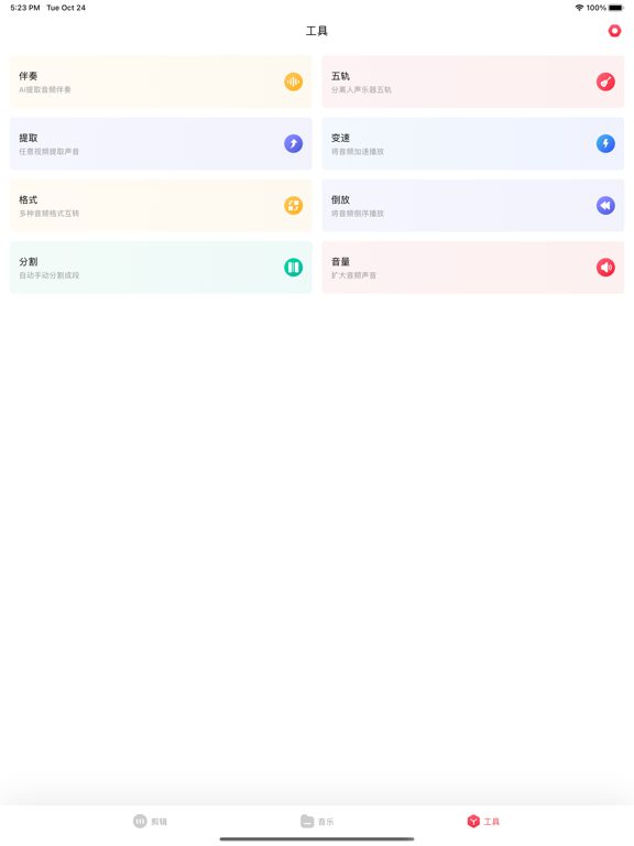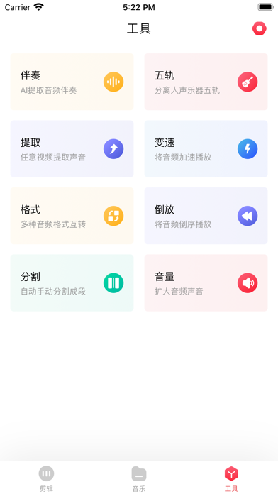 专业音频音乐剪辑软件! 支持对MP3、M4A、AAC等多种格式文件进行剪辑编辑。 强大的音乐音频编辑功能: 「多轨剪辑」可以在多个轨道对音频进行混音、拼接、分割等操作 「快速混音」支持多段音频一键混音 「音频编辑」支持音频混音、变音、淡入淡出、快慢速等功能 「音频拼接」支持两个或多个音频文件合并拼接成新的音频 「音频分割」自定义音频裁剪范围,一键随意快速分割 「格式转换」轻松将mp3/wav/wma/aac/flac/amr/ac3/m4a/aiff等多种音频格式互转 「音量调整」自由调整音量声音 「音频提取」从任意视频提取背景声音 「人声提取」支持分离歌曲音乐中的人声和伴奏 「五轨分离」从歌曲中分离出人声、鼓、贝斯、钢琴、吉他等乐器音轨 「音频降噪」轻松降低原音频的各种细微噪音 「铃声制作」支持一键设置为手机铃声 不管你是专业音乐人或是音乐小白,都能随心所欲剪辑编辑制作音乐,极简操作风格,上手很简单,快来制作你的音乐吧!调整优化,维护更新。