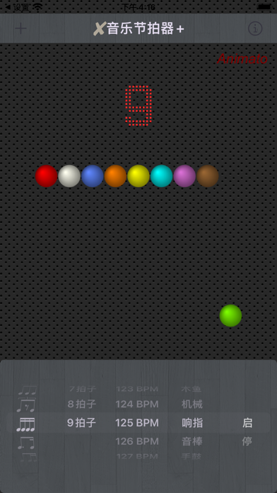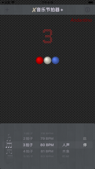 这个专业的节拍器(Metronome)为您提供精准、稳定的各种音乐节拍和节奏;有多种节拍声、节奏型供选择,带“人声数拍”;功能完全覆盖了传统数字节拍器;是音乐、舞蹈、体育锻炼的好伴侣。 节拍器使用非常简单,操纵主页面下方的5个“滚轮”就可以完成所有操作。 这里凝聚了我们十多年的心血。我们设计、生产了大量目前市面上流行的电子节拍器,作为升级替换产品,我们推荐这个App。