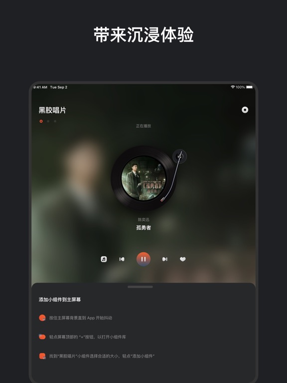 是否怀念曾经黑胶唱片的那些日子,在那绚烂充满故事感的时代,经典的黑胶旋转出动人的旋律。本应用带你体验复古与现代的碰撞,享受更便捷的播放方式,在手机桌面加入黑胶的经典样式组件,再次身临其境复古典雅的音乐氛围。 特色功能 - 三种主题风格,黑胶唱片、音乐律动、白胶唱片,给你带来不一样的视觉体验 - 多种桌面小组件样式,实现精美布局 - 桌面组件快捷按钮,可随时切换、暂停及收藏歌曲 - 支持Apple Music - 可视化音乐专辑封面和音乐信息 如果您在使用的过程中有任何问题以及建议,欢迎在App内向我们反馈。- 修复切换播放器风格时偶尔没反应的问题 - 优化点击上一首按钮反应较慢的问题 - 修复切换歌曲时,「喜欢」状态需较长时间才能显示的问题