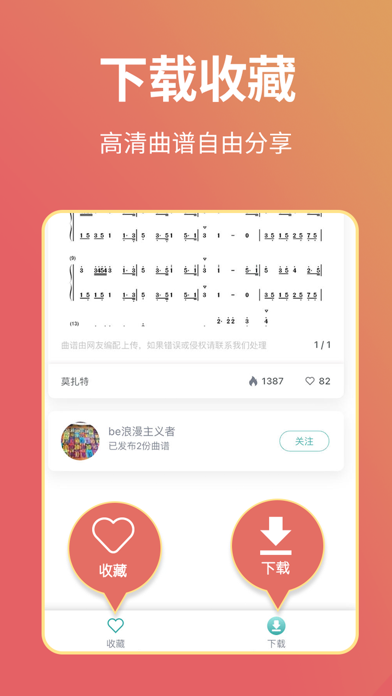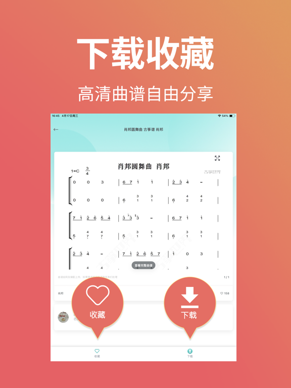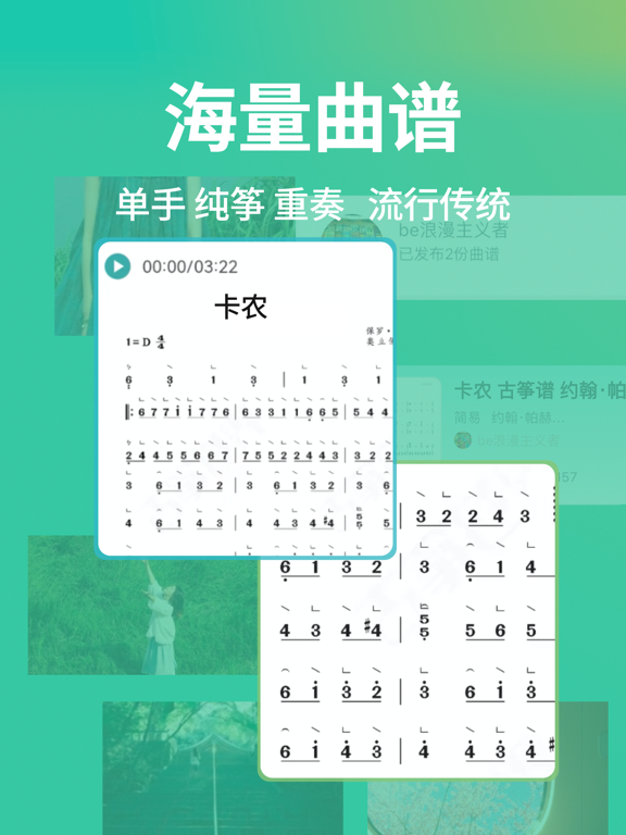 古筝世界APP,探索千年音乐之美! 学琴、练琴路上千辛万苦?找不到适合自己的好曲谱?网上的谱子五花八门,格式混乱,你敢用?还懊恼于零基础入门,没有伙伴一起交流?更头疼的是,抖音上刷到自己的想秀一把曲子却找不到曲谱? 那就来看看古筝世界吧!我们为手机和平板用户设计了一款古筝爱好者的乐谱应用,这款APP适用于古筝初学者和已经掌握简谱与指法技巧的古筝达人。 我们的高清古筝谱库包含国风,儿童,影视,传统,现代创作练习曲谱等专业曲谱,以及时下热门、经典的流行曲谱。曲谱可试听,可下载。 此外,我们还拥有百万社区用户,共享优质曲谱资源,让你轻松找到所需的谱子。 重要的是你可以下载收藏自己喜欢的谱子。同时如果你有自己喜欢的曲子想要分享给其他琴友,也可以轻松上传,学琴路上结识更多志同道合的琴友! 我们精心打造了这个APP,旨在让您深入了解古筝音乐的奥妙,并提供一系列的功能和体验。 学习教程:从基础到高级各种古筝技巧在等着你探索。 音频试听:畅享各种古筝演奏家的音乐作品,从经典传统到现代创新,欣赏美妙旋律,让你陶醉其中。 琴友互动:与来自世界各地的古筝爱好者互动,分享您的演奏和学习经验,结交志同道合的朋友。 精致设计:无论您使用手机还是平板,都可以体验我们以简洁、直观的用户界面。 赶快加入我们吧! 欢迎来到古筝世界,一起走进中国传统音乐的神奇之地。 别再拖延,立即下载古筝世界APP,开始您的音乐之旅! 自动续费服务声明付款: 用户确认购买并付款后记入Tunes账户: 取消续订:如需取消续订,请在当前订阅周期到期前24小时以前,手动在iTunes/.Apple ID设置管理中关闭自动续费功能,到期前24小时内取消,将会收取订阅费用 续费:苹果Tunes账户会在到期前24小时内扣费,扣费成功后订阅周期顺延一个订阅周期 隐私政策 - http://gz.yinlvtiaodong.com/policy.html 用户协议(含自动续费条款)- http://gz.yinlvtiaodong.com/protocol.html新增指法难度标签