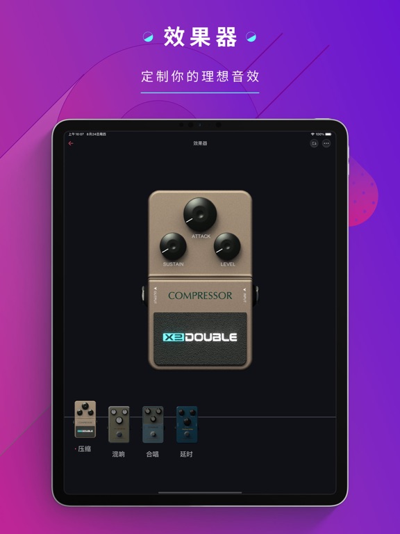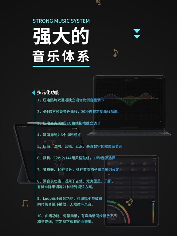 Double+是德博声学基于用户思维让初学用户更有趣让专业用户更系统的理念打造的一款吉他数字化智能拾音系统操控软件。 功能特点: 1,压电贴片双通道独立混合比例音量调节 2,4种官方预设音色曲线,20种自我定制曲线功能。 3,压电麦克风8段EQ曲线拖拽独立调节 4,啸叫抑制4-6个抑制频点 5,压缩、混响、合唱、延迟、失真数字化效果细节调 6、鼓机、12x12/144组风格鼓组,12种音源选择 7、节拍器、10种音色,多种节奏拍子组合练习设定 8、调音表功能,适用于吉他、尤克里里、贝斯、有标准降半调等21种特殊调弦方案。 9、Loop循环录音功能,可编辑小节鼓组同时录音循环播放,无限循环录音。 10、曲谱功能、海量曲谱,有声曲谱同步播放,和弦查询,可定制下载我的曲谱集。 总结:它是一款集吉他演奏练习教师教学一站式智能辅助工具,应用场景,初学者练习辅助,演奏家舞台演出,琴行教师教学辅助,德博声学倾力打造,科技赋能音乐,让你的音乐梦想触手可及。适配Smart 1s 设备