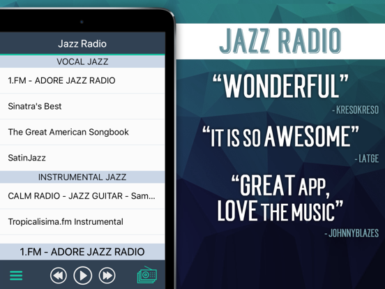 爵士乐电台 - 热播美国广播电台音乐 提供下列电台: ******** Vocal Jazz ******** Sinatra Style - JAZZRADIO.com Vocal Legends - JAZZRADIO.com Stardust. Crooners, Swing, and Bigband Vocal Jazz - JAZZRADIO.com Smooth Vocals - JAZZRADIO.com ***** Instrumental Jazz ***** Piano Jazz - SKY.FM Guitar Jazz - JAZZRADIO.com Piano Jazz - JAZZRADIO.com Piano Trios - JAZZRADIO.com CALMRADIO.com - JAZZ PIANO Trumpet Jazz - JAZZRADIO.com Saxophone Jazz - JAZZRADIO.com ******** Specialty Jazz ******** Classic Jazz - JAZZRADIO.com JAZZ FM 91 - High Standards JAZZ FM 91 - The Grooveyard Pat Metheny Radio Avant-Garde - JAZZRADIO.com Current Jazz - JAZZRADIO.com Fusion Lounge - JAZZRADIO.com Swing & Big Band - JAZZRADIO.com Sonic Universe = SomaFM Datempo Lounge - SKY.FM ******** Bossa & BeBop ******** Bossa Nova Jazz - SKY.FM Bossa Nova - JAZZRADIO.com Bebop - SKY.FM Bebop - JAZZRADIO.com Hard Bop - JAZZRADIO.com ******** World Jazz ******** Gypsy Jazz - JAZZRADIO.com Paris Café - JAZZRADIO.com Anuhea: Hawaii's Refreshing Jazz Ambiente FM - Tenerife Canary Islands M2 JAZZ - Live From Paris Latin Jazz @ Batanga.com Islas Canarias - Cool Jazz DCsoundstream- mix of Jazz, Fusion, & World Latin Jazz - JAZZRADIO.com ******** Chill Jazz ******** RelaxingJazz.com Mellow Jazz - JAZZRADIO.com Cool Jazz - JAZZRADIO.com Breezy Radio CALMRADIO.com - JUST JAZZ 181.fm - The Breeze ******** Smooth Jazz ******** A1Smooth - 24 Hr Smooth Jazz Absolutely Smooth Jazz - SKY.FM AddictedToRadio.com - Smooth Jazz Amazing Smooth and Jazz BEST SMOOTH JAZZ - UK SmoothLounge.com Vocal Smooth Jazz - SKY.FM Smooth Jazz - JAZZRADIO.com FM5280 Smooth Contemporary Jazz Smooth Uptempo - JAZZRADIO.com ******** Various Mix ******** AddictedToRadio.com - Jazz Masters AAC The Avenue 91.1 City Sounds Radio Jazz DELUXE RADIO Fair Harbor Radio Ganymed Jazz - Contemporary Jazz GotRadio - Jass So Smooth" GotRadio - Jazz So True GrooveFM - You better listen! Jazz All The Time - Playing great jazz Jazz Classics - SKY.FM Jazz FM | UK TheJazzGroove.com The Jazz Mix - New Jazz Jazz Radio - infomaniak.net Jazz Wyoming jazz89 KUVO laut.fm/jazzloft laut.fm/jradio KCSM Jazz91 * The Bay Area KSDSFM TheMorningCoffeeMix wavjazz.net The Oasis Radio Neptune Radio Jazz laut.fm/thejazzofwiesbaden TSF Jazz WAER - Central New York The Wave KHJZ-HD2 WRTI Jazz WWNO 3 - Jazz - New Orleans For more information, including Terms of Service & Privacy Policy, visit myindieapp.com. Thanks for listening! 请尽情享受!• Latest iOS Support • Bug Fixes & Improvements