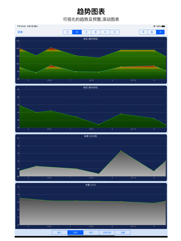 血压记录是您了解和掌握您的血压,体重,体温和其他健康数据必备的应用。 它可保存无限多的血压记录,并将数据图表化。它还会为您提供数据统计分析报告,为您找出血压和药物治疗的关联性。它还可以把数据以电邮的形式输出,以文件形式导入, 同时为您设置事项提醒。总之这是一款功能强大的健康生活所必备的应用。 综合的数据收集 - 您难道不想只用一个应用程序来记录所有的健康和医疗数据吗?这个应用程序就是为此设计的。 * 全面综合的数据收集表 (部分项目需升级) 可自由调整的输入数据表格 简单的用户界面 优化的键盘选择 * 药物治疗关联性 - 您是否一直想了解药物治疗究竟是怎样影响您的生命体征的呢?血压值在左右手臂上有何不同?这个应用程序就是为此设计的。 口服和注射药物治疗的记录以及对血压影响的关联性 左右手臂血压值的记录以及关联性 身体位置的记录以及对血压值的关联性 膳食的记录以及对血糖的关联性 (需升级) 将来会更多。不妨告诉我们您还需要什么 * 数据图表化 - 一张图胜过千言万语。画出的图表不仅使您对自己的各项生命体征有一个总体把握,同时它还会以颜色来区分和提醒(只适用于血压值) 所有的各项生命体征都以图表形式显示 无任何时间限制 滑动图表,显示更多的数据历史 优化的绘图性能 * 数据输出及导入 - 简单又却多样的电邮数据输出形式,方便让您和医生交流 多样的输出格式 (PDF, CSV, 文本) 可自选的时间段 可自选的生命体征类别 图表也包括在电邮中 灵活的数据导入格式识别 详细的导入帮助信息和反馈信息 * 其他多种多样功能 植入式的事项提醒,让您再也不用担心会错过下一次检查 支持多用户,一个应用适用全家 (需升级) 可调整的中午时间,让上/下午对您更有意义,哪怕您是夜猫子 可调整的警告界限 (只适用于血压值) 支持公制和英制单位 注意: 本应用无法驱动任何医疗设备,所有数据需要手动输入。1. 修复设置提醒事项中的问题。 2. 性能改进。