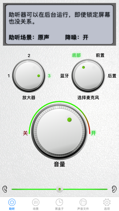 利用苹果手机的多个麦克风和先进的音频算法把手机变成高级助听器或监听器。 特性: 1、3级音频放大器。用户可以选择适合自己的音量放大级别,舒适听音。调整音量,丝般顺滑。 2、听力保护。放大音量可以听清微小的声音细节,但是如果不加限制地放大任何声音,巨大的声响会引起耳朵疼痛、头晕等症状,甚至永久损伤听力。本app采用先进的算法,放大弱音细节的同时抑制强音,不但让声音听起来清晰悦耳,还能保护您的听力。 3、多场景选择。本app加入为增强听力而专门设计的12段音频均衡器,并提供预设的6种听音场景,分别针对会话、音乐、影视以及高、中、低三种频段的听力损失。用户也可以根据情况定制自己的场景。从而能精确补偿听力损失,微调声音细节。 4、麦克风选择。目前,不同型号的iPhone提供3到4个麦克风。它们分别位于手机下面、前面听筒位置和背后摄像头旁边。您可以根据手机放置位置和音源方向选择对准音源的麦克风,从而获得更清晰的声音。同时可以隐蔽监听。 5、黑盒子功能。就像飞机的黑盒子一样,此助听器始终保持刚刚过去5分钟的声音信息。您可以随时回放、永久保存,让您不错过任何有用信息。 6、拥有专业录音机功能。 7、高品质采样。使用CD音质的采样率,让声音细节完美呈现。 8、降噪。打开降噪,将有效降低环境噪音,让声音更清澈纯净。 9、支持蓝牙和有线耳机。 10、在后台和音乐、视频、游戏软件并行。本软件支持和绝大多数音乐、视频、游戏软件同时运行。即使您听着音乐、看着视频、玩着游戏也能监听声音。 11、支持左右耳音量分配。 12、后台运行和极低能耗。即使锁定屏幕,软件也可以正常使用。 13、提供七天时间免费试用完整版 法律信息: 请阅读助听器 - 监听神器的服务条款和隐私策略 服务条款:http://www.dawnstreamsoft.com/tou_cn.html 隐私策略:http://www.dawnstreamsoft.com/privacy_cn.html 订阅 助听器 - 监听神器可以被免费下载。我们向所有用户提供7天免费试用期。如果免费试用期过后您还想继续使用,我们提供自动续订的月度订阅服务:$4.99/月 除此以外,我们还提供另外两种订阅方式: 一季度:$13.49 ($4.49/月) 一年: $35.99 ($2.99/月) - 付款将在确认购买时向iTunes帐户收取 - 订阅自动续订,除非自动续订在当前期限结束前至少24小时关闭 - 账户将在续约结束前的24小时内收取续约费用 - 订购可由用户管理,购买后可通过转到用户的帐户设置关闭自动续订 - 在有效订阅期间不允许取消当前订阅 联系我们 如果您有任何问题或建议,请您联系我们。可以发电子邮件到support@dawnstreamsoft.com, 注明助听器相关。或者请访问我们的网站:http://www.dawnstreamsoft.com 期待收到您的消息。优化软件,提升用户体验。