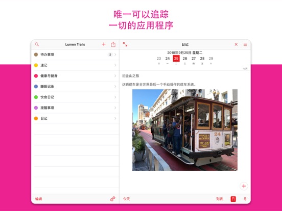 • Apple 的“新的一年,新的你”中最受欢迎产品。 • Apple App Store 员工最喜爱产品。 Lumen Trails 可以让您记笔记,列清单和对您生活中的其它事情进行追踪,如:时间、锻炼、开销、卡路里、食物、体重、睡眠,以及几乎任何您想得到的事情。成千上万的人每天都使用并喜欢它,因为,它为他们的生活带来了真正的变化。 Lumen Trails 最令人满意的地方便是它能够跟踪任何事情。有大量的其它应用程序可以让您跟踪一两种事项, 譬如, 卡路里和体重。但如果您要打算跟踪其它东西的话, 那该怎么办呢?比如,您尝试戒烟时想要跟踪您抽了多少根烟、您的饮食习惯、甚至是您的净资产?Lumen Trails就是能够提供这种功能的程序! 您可以对您的主屏幕进行清理,只留一个程序程序就可以做所有的事情,而不再需要一个程序列出代办事项清单,一个程序追踪开销,另一个程序追踪您的体重了。 Lumen Trails 是专为 iPhone 和 iPad 而设计的,功能非常强大,简单易用,在视网膜显示屏上看起来非常漂亮。 它甚至还可以自动将您的数据备份到 Google Drive (以iCloud为标准)上,并且完全可以通过 Apple VoiceOver 使用8种语言进行访问,简真是无与伦比。更为甚者,您的数据不会被锁定在您的iPhone中。您可以将它导出至Excel或Google Docs中! 那么,现在什么是对您来说真正重要的呢?您的健康?体格?财政?工作效率? 追踪并完成这些重要事情! :: 有问题吗? 请访问www.lumentrails.com,我们会在这里帮助您的。基于您的反馈进行修复和功能改进。