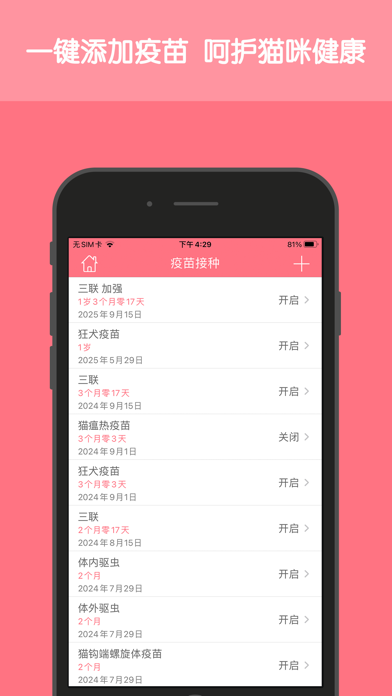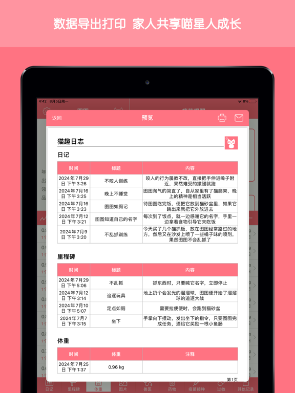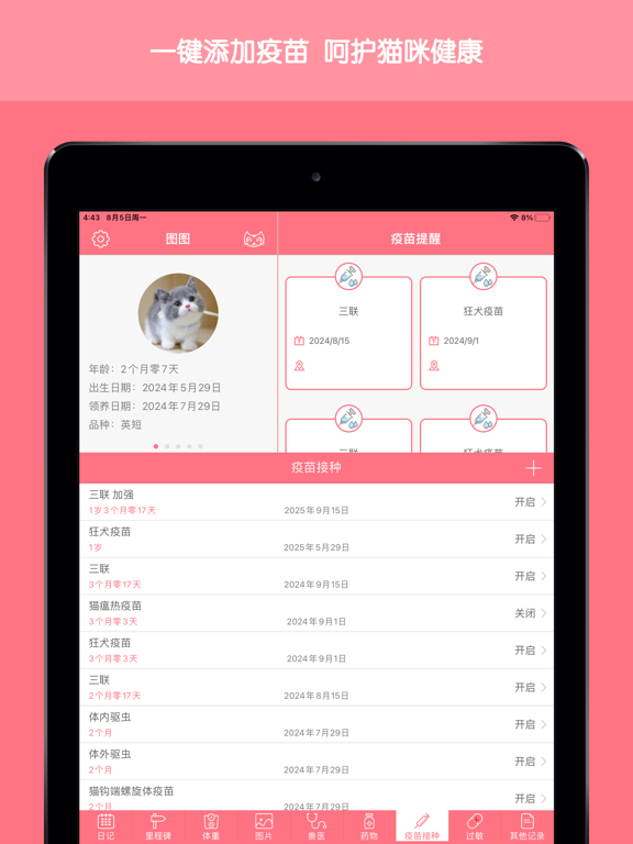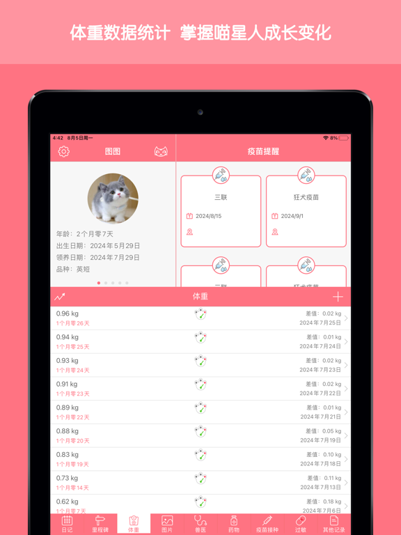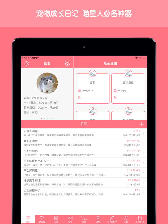 猫趣日志 是一款专为猫主人设计的应用程序,使用此应用程序,您可以跟踪猫的日常生活并与家人和朋友分享您的猫。它可在 iPhone 和 iPad 上使用。 您可以写猫的日记,记录宠物的成长里程碑并添加照片作为纪念品,跟踪猫的体重,保存猫的照片,并跟踪猫的兽医、药物、疫苗接种、过敏和其他与您的宠物相关的信息。使用此应用程序,您可以与家人和朋友分享您猫的日常。 主要功能: - 为你的猫写日记。 - 记录猫的成长里程碑,出生、长出新牙、坠入爱河等,您还可以在此模块上添加照片作为纪念品。 - 跟踪猫的体重(公斤或磅)。 - 将猫的照片存储为她的个人相册。 - 编辑兽医信息,如姓名、电话号码、地址和其他备注。 - 跟踪猫咪用药信息,如药物名称、剂量、频率、副作用等。 - 跟踪猫咪疫苗信息。 - 跟踪猫咪过敏信息。 - 编辑您希望存储给猫咪的其他信息。 - 添加疫苗提醒。 - 支持 WiFi 备份和恢复。 - 支持 Dropbox 备份和恢复。 - 支持通过电子邮件导出数据。 - 支持 iPhone 和 iPad 版本。 如果您有任何问题或建议,请直接发送邮件至 userfeed@vip.tom.com ,谢谢!⁃ 兼容了iOS 18。 ⁃ 增加了加泰罗尼亚语、丹麦语、希伯来语、匈牙利语、罗马尼亚语、斯洛伐克语、瑞典语、西班牙语和越南语。 ⁃ 修正了一些小问题。
