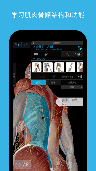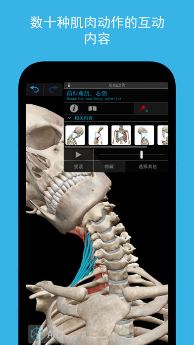《肌肉与运动机能学》是一个了解肌肉和骨骼如何相互作用以及常见伤害和病症如何发生的详细指南。在这个方便的袖珍参考里探索数以千计的三维模型,可视化和学习肌肉骨骼的结构、功能、运动和病理学—非常适合忙碌的医师、运动员、瑜伽老师和学生使用。 * 在任意观察点或缩放级别探索数以千计肌肉、骨骼、韧带、滑囊、神经和脉管系统的三维模型。 * 借助扭伤、颈神经根病、半月板撕裂、腕管综合症、骨刺等令人眼花缭乱的三维模型,将正常解剖结构与常见病理进行对比。 * 操控几十种肌肉动作动画(甚至在中幅度移位中),来了解肌肉运动的生物力学。向患者和学生展示肌肉和骨骼如何相互作用,执行旋前、内收、屈曲等特定动作。 * 在app中访问有关数以千计解剖结构中任何之一的详细信息,包括深入的定义、交互式肌肉附着点、骨性标志、神经支配、血供等。 基础购买包含可以剖析的完整男性和女性大体解剖模型、常见肌肉动作、几十种常见病理学模型和五段动画。 附加的《肌肉骨骼病理学动画》的app内购可扩展这一指南,涵盖学科专家在解剖结构、功能和病理学方面的一系列深入介绍。内容和功能的重大更新!iPhone和iPad版肌肉和运动机能学的内容现已包含更新后的男女解剖结构和常见疾病的三维视图,还新增了筋膜部分和高级分享功能。 - 在3D中探索50余种精选病理学内容,如粘连性关节囊炎、外胫夹、腕关节扭伤和足底筋膜炎。 - 理解界定上肢和下肢肌肉间隔的筋膜和隔膜。 - 制作与模型集关联的交互式3D演示文稿,用来解释和复习主题。使用标签、注释和3D画图来标记各种结构。与患者、同学、学生和同事分享内容!