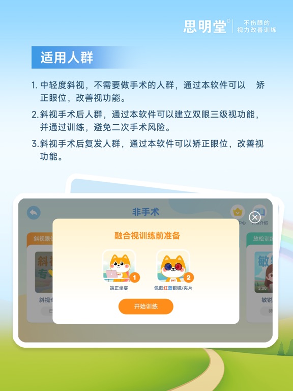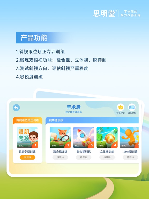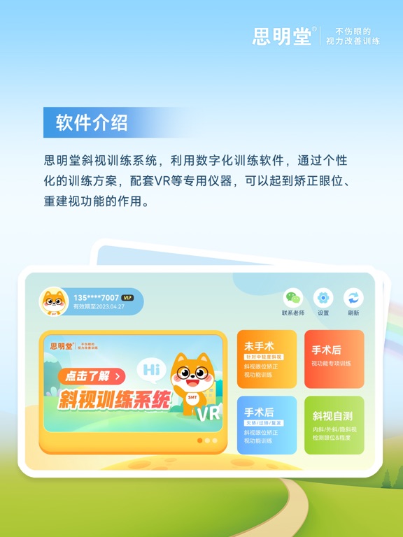 【软件介绍】 思明堂斜视训练系统,利用数字化训练软件,通过个性化的训练方案,配套VR等专用仪器,可以起到矫正眼位、重建视功能的作用;对于已经做过手术的会员,可以在如下四个方面有明显改善作用: 解决手术带来的欠矫和过矫问题、消除复视、锻炼眼球肌肉均衡性避免二次手术、建立双眼三级视功能(重点是融合视和立体视)。 【产品功能】 1、斜视眼位矫正专项训练 2、锻炼双眼视功能:融合视力、立体视、脱抑制 3、测试斜视方向、评估斜视严重程度 4、敏锐度训练 【适用人群】 1、中轻度斜视,未达到手术标准的人群,通过本软件可以矫正眼位,改善视功能。 2、斜视手术后人群,通过本软件可以建立双眼三级视功能,并通过训练避免二次手术风险。 3、斜视手术后复发人群,通过本软件可以矫正眼位,改善视功能。 【联系我们】 您在使用过程中有任何问题,或有好的建议,欢迎通过如下方面联系我们: 官方客服微信:simingtang2023(思明堂斜视训练朱老师) 微信公众号:思明堂 小红书官方号:思明堂斜视矫正训练 手机号:133-6192-3863优化功能与界面