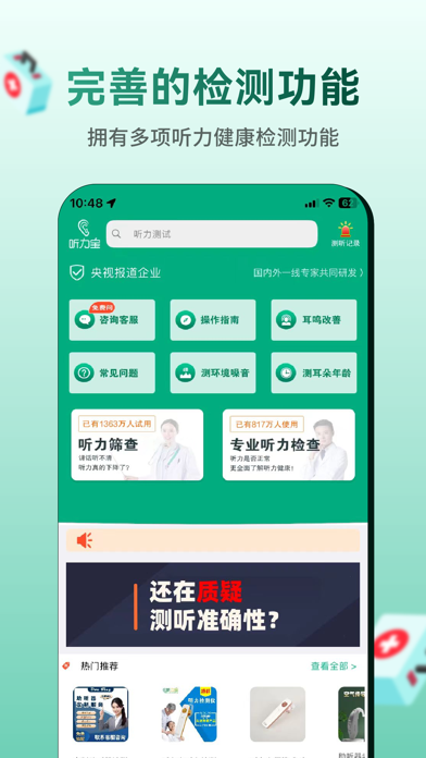 保护听力,从听力检测开始! 【免费测试】免费纯音听力测试检测人语常用的四个频率:500Hz、1KHz、2KHz、4KHz ;测试声音强度范围在20dB-60dB。测试结果会告知您听力是否受损,如果需要更精确的测试结果,您可以使用精准测听来做专业听力测试。 【精准测试】精准纯音听力测试检测人语的七个频率分别为:125Hz、250Hz、500Hz、1KHz、2KHz、4KHz 、8KHz;测试声音大小强度范围在15dB-90dB。测试结束给出专业的听力损失结果,经验证该测试结果符合国际标准。保护听力,从为自己做一个听力体检开始。 【言语测听】基于标准化的普通话言语测听材料,可以辅助进行单音节识别率、双音节识别率、语句识别率测试。 【耳鸣改善】豆听科技与美国纽约州立大学的孙伟教授共同研发的耳鸣改善技术,通过耳鸣康复5部曲——耳鸣评测、耳鸣评判、耳鸣方案、耳鸣改善、康复评估,来改善缓解用户耳鸣情况。耳鸣改善方案包含低频、中频、高频多个频段共54种,基于听力测试为您匹配一对一的私人改善方案,耳鸣缓解率达到26%,致力于打造耳鸣朋友的安静生活! 豆听科技期待与您共创健康未来! 微信客服:tinglibao_ 提示:如您使用过程中有任何问题,请咨询客服。本软件的听力测试和耳鸣改善方案功能不能替代医疗,如疾病已很严重,请立即到医院就医。 Tips: If you have any questions during your use, please consult customer service. The software's tinnitus treatment can not replace medical treatment, such as tinnitus disease is very serious, please go to the hospital immediately. Disclaimer: Please seek a doctor’s advice in addition to using this app and before making any medical decisions.1:页面UI完善 2:修复跳转问题
