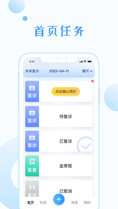 优医患者端—让关爱 更有温度 预约管理 用户预约,预估当日工作量,设置到访日期,当日接待人数 用户管理 工作人员为用户定制任务方案,用户可以完成任务内容;工作人员根据用户任务完成情况,对用户进行全面的评估 档案管理 通过用户上传的各种报告及记录及各种体征数据,建立用户档案,完善用户数据,进行用户的长期管理- 优化用户操作体验和稳定性提升
