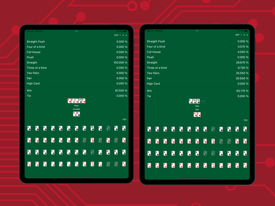 【标题】 蒙特卡洛算法的扑克计算器。 【大纲】 此应用程序使用 Monte Carlo 模拟算法来计算在扑克游戏中发到特定手牌的概率。 该算法模拟随机纸牌组合数千次,以估计特定手牌出现的频率。这允许它得出准确的概率值。 该应用程序允许用户选择他或她想要的手牌类型。例如,如果用户想知道出现同花的概率,用户选择同花,然后算法随机分配一些牌并计算同花出现的频率。 该应用程序允许用户更改手的类型并重复模拟。该应用程序还可以图形方式显示结果,让用户直观地看到手型出现的频率。 最后,该应用程序还提供可能对扑克玩家有用的其他信息。例如,它提供有关哪些手牌比其他手牌出现概率更高的信息,以及玩家如何采取最有效的策略来赢得扑克游戏。 【特点与优势】 1. 提高扑克获胜概率:通过这个应用程序,玩家可以知道他们持有的牌的确切概率。这使他们能够做出更准确的决策并获得更高的胜率。 2.改进的游戏策略:通过使用这个应用程序,玩家可以看到在扑克游戏中哪些牌比其他牌出现的概率更高,以及玩家如何采取最有效的策略来获胜。 3. 改进练习:该应用程序允许玩家更有效地练习他们的扑克游戏。玩家可以选择一种手牌类型,让算法自动模拟它数千次。 4. 提高扑克知识:该应用程序可以让玩家加深对扑克的了解。该应用程序提供有关扑克中不同策略和概率的信息。 5. 基于概率的决策支持:该应用程序允许玩家做出基于概率的决策。玩家可以做出更准确的决定,因为他们知道一手牌的概率。 游戏可以离线玩。 自动计算德州扑克赔率 自动计算获胜概率 ・改变卡片图案。 【支持的手】 1. 皇家同花顺:10张同花色J、Q、K、A牌的组合。最强手。 2.同花顺:同花色连续五张牌的组合。 3.四张:四张相同号码的牌和任意一张牌的组合。 4. 葫芦:三张相同号码的牌和另外两张相同号码的牌的组合 5.同花:五张同花的组合。 顺子:五张不同花色的连续牌的任意组合。 6. 7、三张:三张相同点数的牌和两张任意点数的牌的组合。 8. 两对:两张相同号码的牌,两张相同号码的另一张牌,以及任意一张牌的组合。 9. 一对:两张相同点数的牌和三张任意点数的牌的任意组合。 10. 大牌:如果以上组合都不适用,则最强的牌获胜。 【推荐给...】 1. 任何想在德州扑克中获胜的人。 2.喜欢打扑克的人 3.想轻松计算一手扑克概率的人。 4.扑克初学者:适合对扑克规则和策略还不够了解的初学者。通过使用该应用程序,您可以学习扑克的基础知识。 5.想练习扑克的人 6. 想根据概率做决定的人:这是给想根据概率做决定的人的。通过使用该应用程序,您可以准确了解自己赢得手牌的可能性,并根据该信息做出决定。 7.想加深对扑克知识的人 8. 适合想提高扑克获胜几率的人。FIX BUG