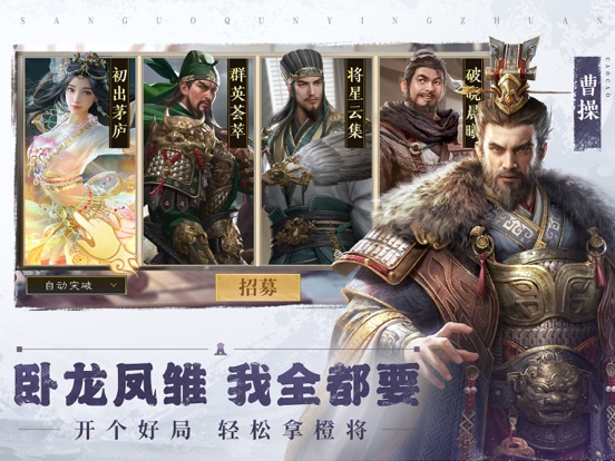 尊敬的主公们,欢迎来到《三国群英传:鸿鹄霸业》 在《三国群英传:鸿鹄霸业》中,您将以一方诸侯身份重回三国,参与角逐天下,通过与其他玩家合纵联盟占领洛阳。开局通过超高的爆率抽取和劝降获得名将,轻松获取大量资源,号令万军战场厮杀;最后剑指洛阳,夺取天下! 【爽抽橙将,玩转双沙盘】 卧龙凤雏,我全都要!三国名将任您抽,还可以运用不同的策略来劝降不同阵营的各路英雄,首周保底18橙将,五虎、桃园等经典阵容轻松配齐,平民也能轻松拥有T0队! 【五谷丰登,轻松有资源】 无损开荒,资源爆仓!资源是你征服天下的基石,车马未到,粮草先行,多种方式轻松获取足够的粮草来支撑你的雄心壮志! 【多种兵种,轻松来进阶】 兵种进阶,轻松制敌!玩家可通过兵种之间的克制以及特性的优劣,来做出多样的进阶选择,打造出历史上赫赫有名的三国特种兵,且看西凉铁骑逐鹿天下,虎豹骑大破关西! 【万人战场,轻松变大佬】 运筹帷幄,号令万军!让你体验高品质的真实三国战场,百万沙盘,万寸之间,奇诡谋士尽情施展,斩将夺旗,尽显英雄本色! 【联系我们】 三群官方微信公众号:三国群英传鸿鹄霸业(gh_5a0b950e7ade) 三群官方网站:https://sgqyz.37.com.cn/ 客服电话:020-22511537修复已知bug,优化游戏体验。