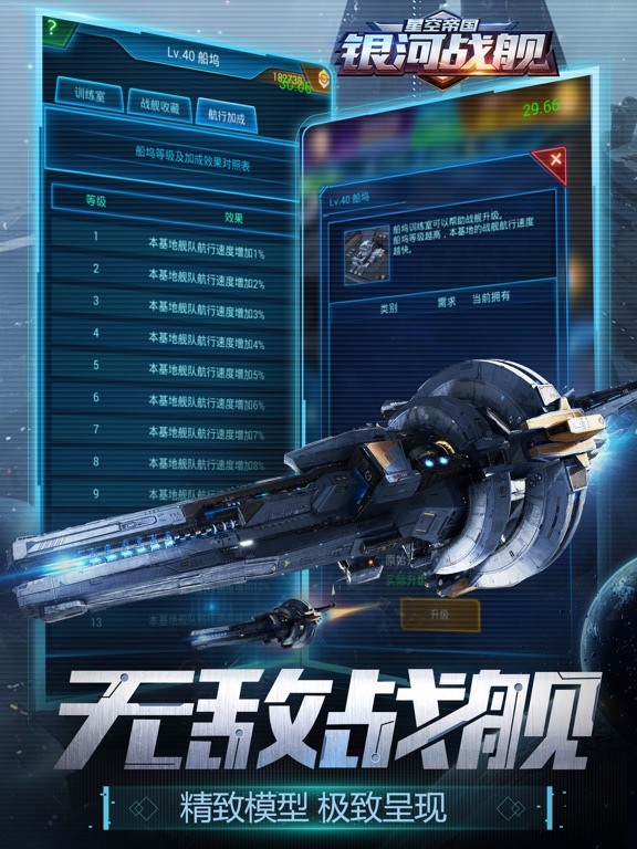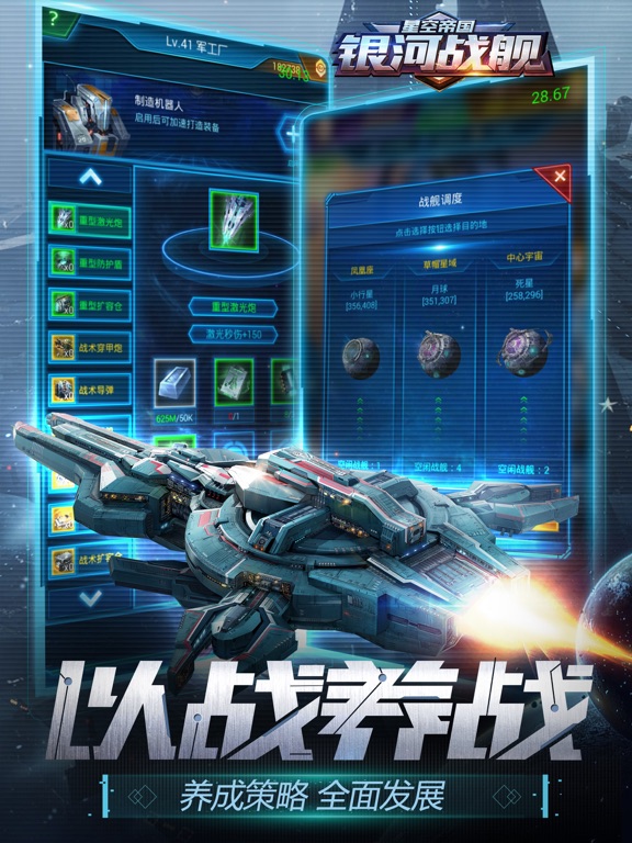 银河战舰-星空帝国,超刺激的星际策略SLG手游! 未来,人类开始了在宇宙的无边探索。宇宙星球之间,资源、领土的分布不均,争端不断,宇宙战争一触即发。 游戏玩家作为星球的总指挥,对内统治自己的家园,发展星球内科技力量和军事力量,研究新型战舰,组成强大的舰队,抵抗入侵者的猛攻。同时需要和其他星球结盟,组成最强战队,一起成为宇宙霸主! 顶级美术团队巅峰之作,绚丽真实的视觉效果,精致多样的模型,为你呈现一场完美的宇宙大战! 游戏特色: =无垠宇宙,广阔地图= ·超多星际秘密等着你去发掘和挑战! =经典重现,星际大战= ·宇宙战争,一触即发,一起成为最强霸主! =战舰系统,极致呈现= ·打造多种无敌战舰,精致模型,横行太空! =策略作战,脑洞大开= ·基地全面发展,养成策略,胜者为王! =玩法多样,灵活备战= ·资源多样,玩法丰富,发挥无穷宇宙力量!优化已知BUG
