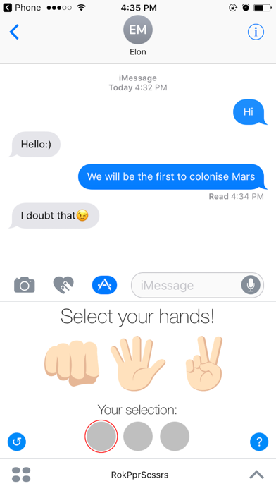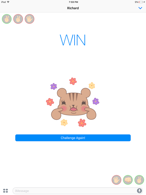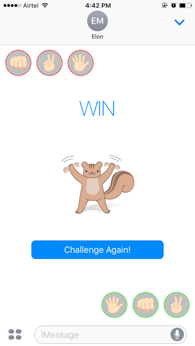 挑战你的女朋友,男朋友或朋友,想要用Rock Paper Scissor打赌! 这是Rock,Paper,Scissors游戏的最佳设计! ;) - www.ProductHunt.com ------------------------------------------------------------------------------------ Rock Paper Scissor iMessage应用程序,让您可以在iMessage中使用联系人。 如何: 下载“Rock Paper Scissors”应用程序 打开iMessage 选择Rock Paper Scissor应用程序 选择你的对手 选择你的动作和发送。 现在等待你的对手做出回应并检查谁赢得了你想要的东西。 游戏规则:(如果你不知道) *纸包罗克 *岩石砸碎剪刀 *剪刀剪纸 按照iMessage指南设计和实施,为您提供易于使用且轻巧的配件,您将拥有它。 Rock Paper Scissors将不断更新和维护,以获得更好的性能。 喜欢我们的应用? 给我们写一个App Store评论! 玩得开心!!- 我们修复了错误并进行了改进,以增强您对应用程序的体验。 如有任何问题或建议,请通过应用程序中的反馈表或通过support@appyogi.com与我们联系。